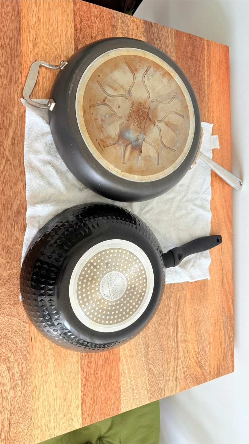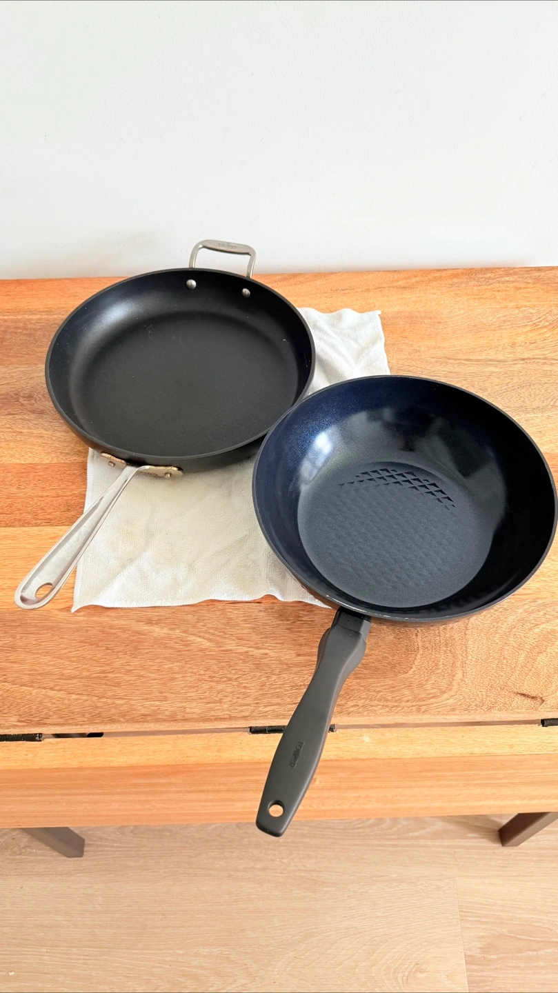 Selling two frying pans. One is an All-Clad frying pan with a stainless steel handle and the other is a Tower ceramic wok.