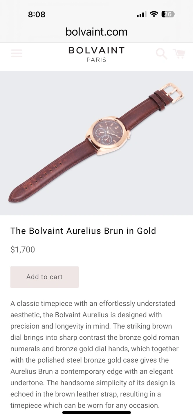 Selling a Bolvaint Aurelius Brun watch in gold! It's a classic timepiece with an effortlessly understated aesthetic. The striking brown dial brings into sharp contrast the bronze gold roman numerals and bronze gold dial hands, which together with the polished steel bronze gold case gives the Aurelius Brun a contemporary edge with an elegant undertone. Originally listed for $1,700, this watch comes with its original box