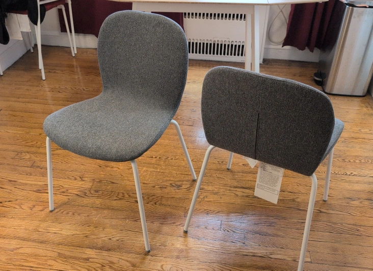 Selling a set of gray dining chairs. They are in great condition, I just had them for a year. Retails as "Karlpetter" at IKEA. They are gray fabric (w/ cushion) and have white metal legs. They retail at 80USD a piece.