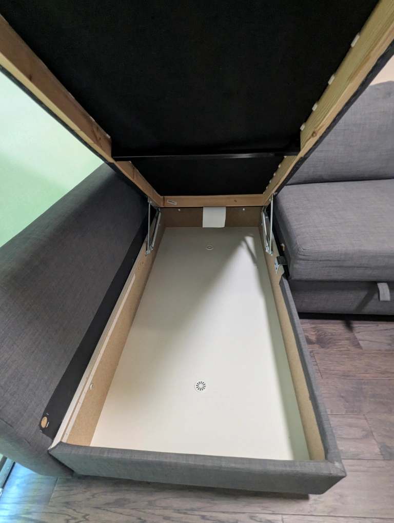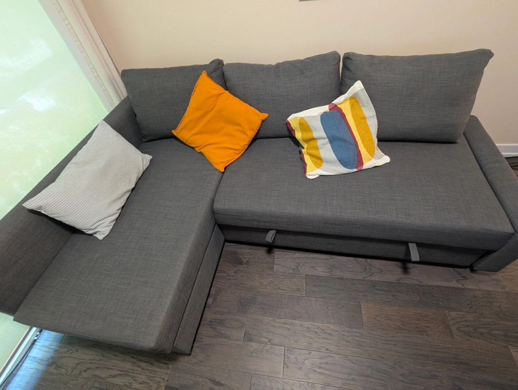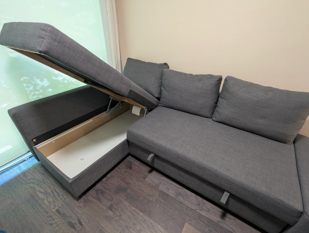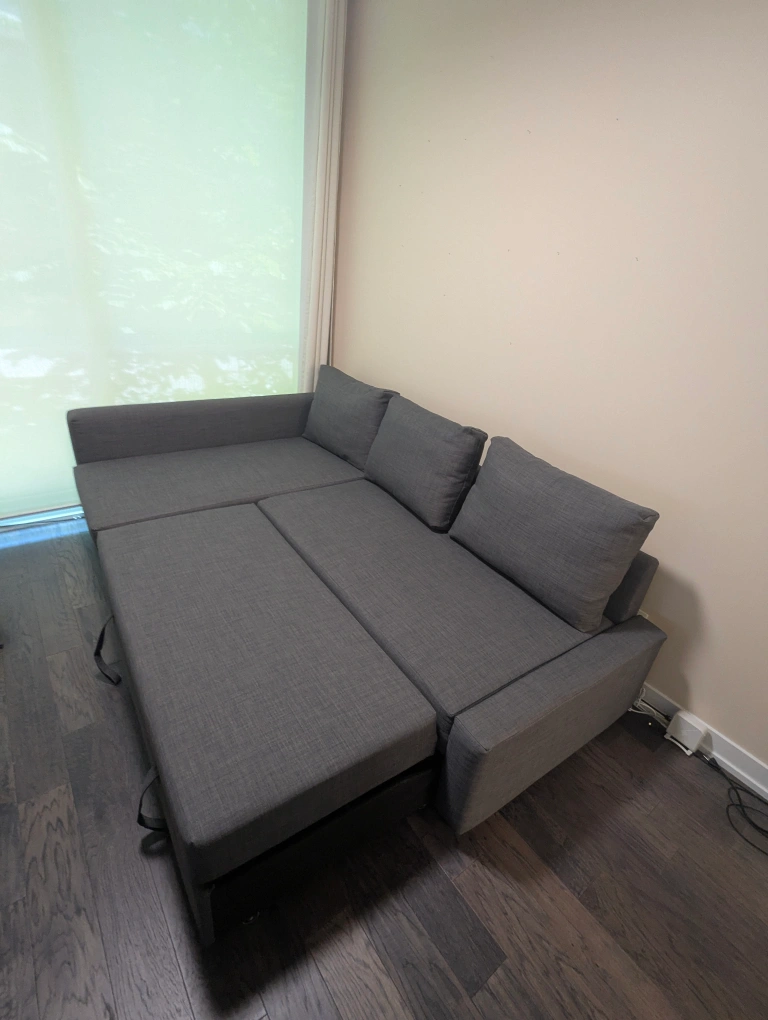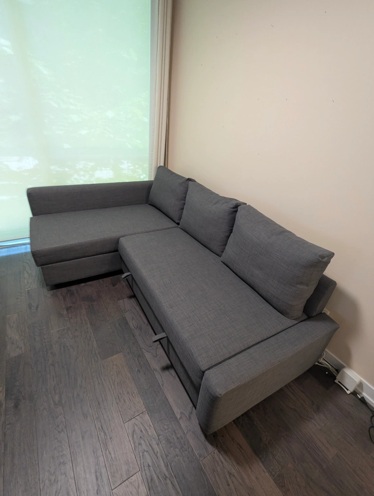 Selling a grey IKEA Friheten sleeper sectional sofa, perfect for small spaces or a guest room. The sofa has a handy storage compartment in the chaise section. It's in good condition and is clean.