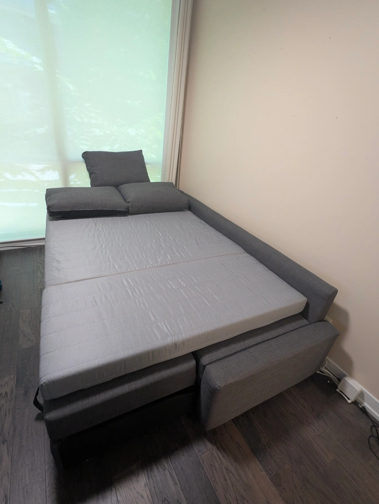 Also including an Ikea Lycksele Lovas foam mattress topper specific to the sofa (4.5" thickness), which can be zipped apart and stored under a bed or in a closet.