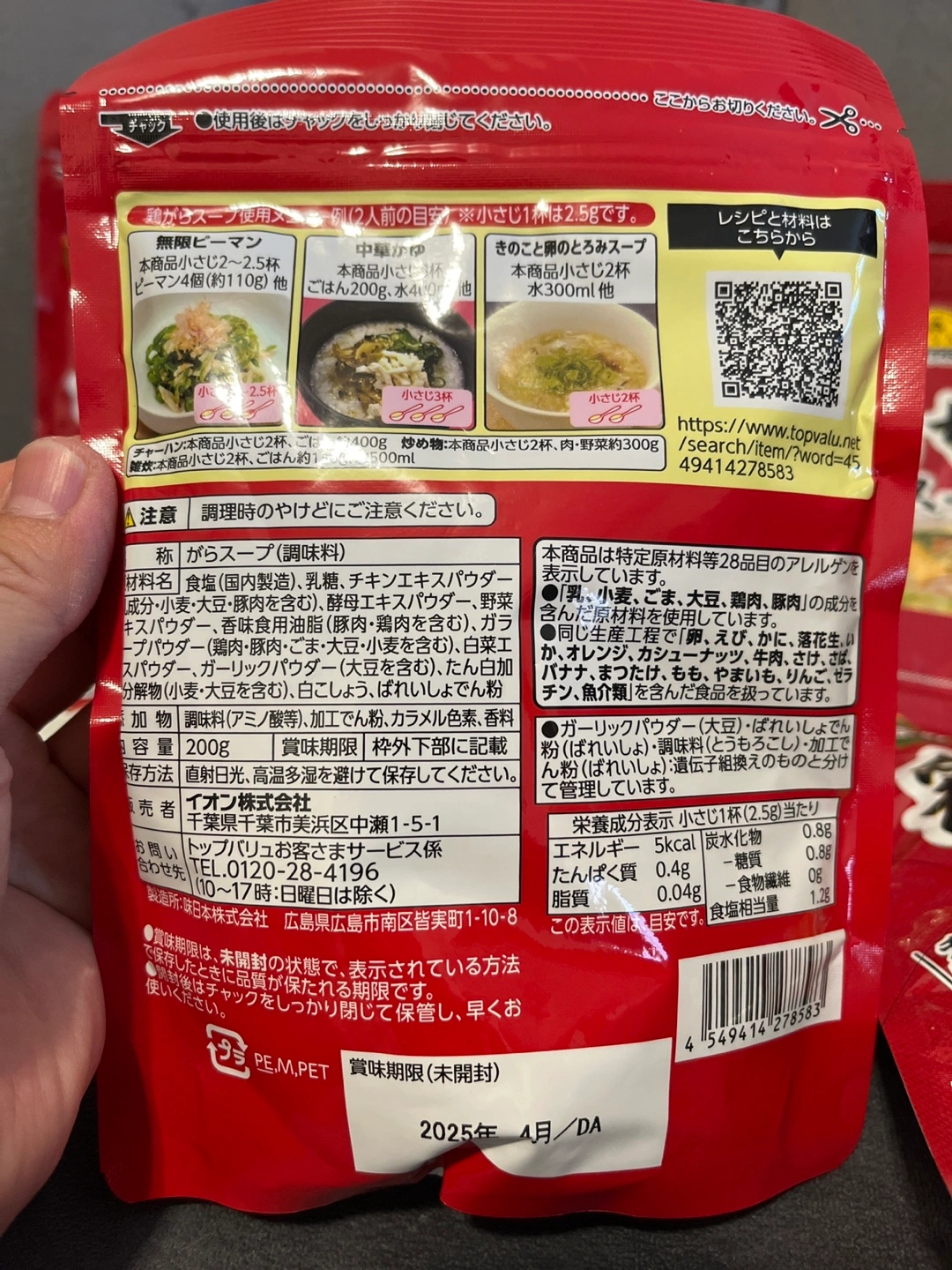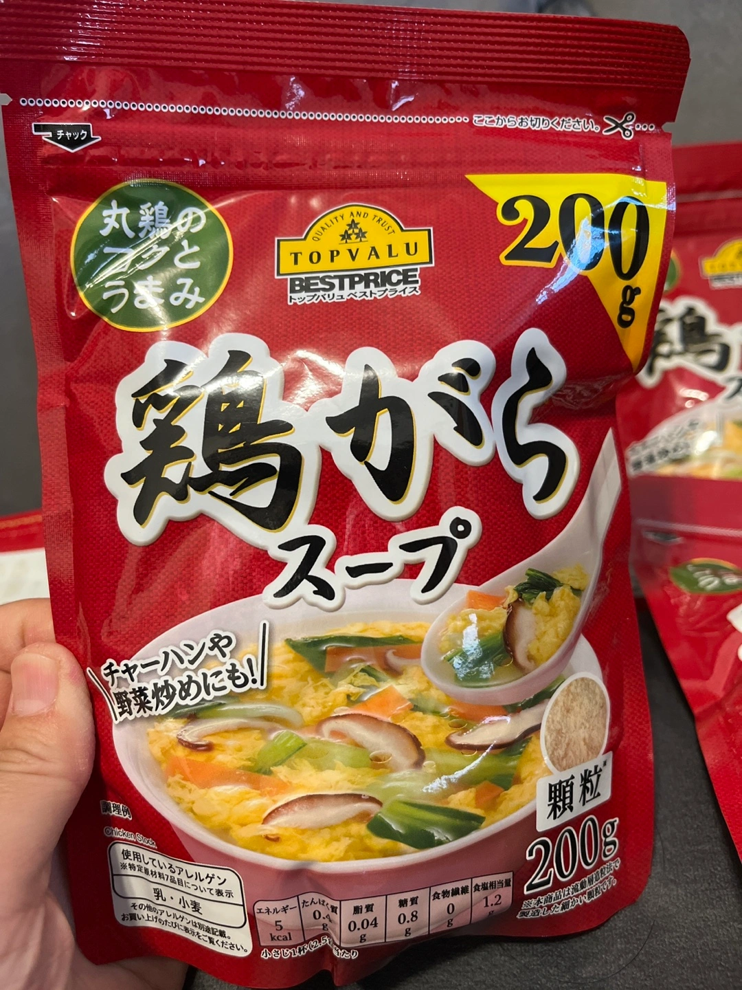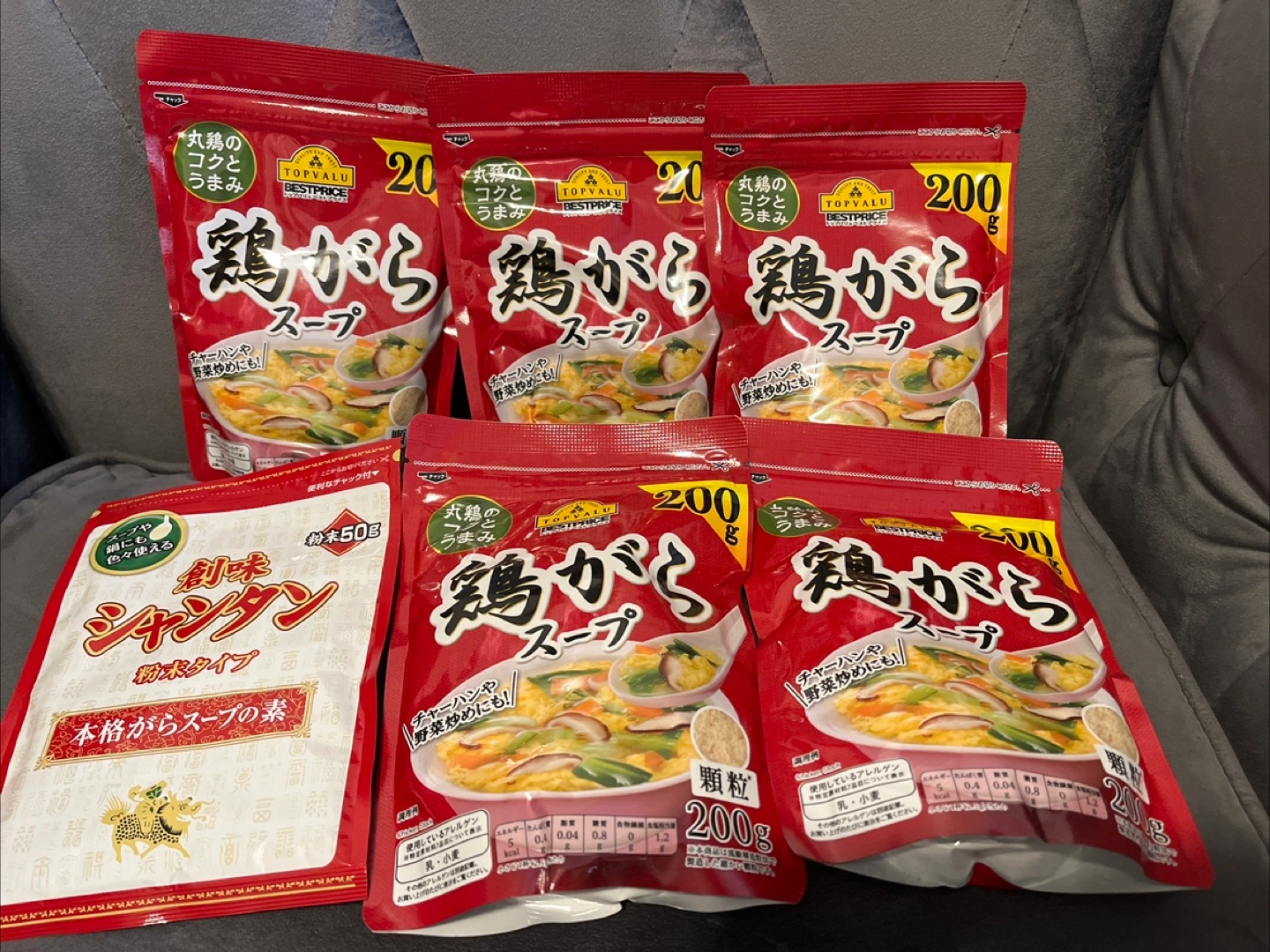 Bags of Japanese power of chicken soup stock. They make amazing taste for your cooking. Im sorry the packages are written in Japanese but it’s easy to use. They are good for not only soup but also fried rice, fried noodles, ramen soup, stir fry vegetables, porridge etc. I’m sorry they are a bit expired.