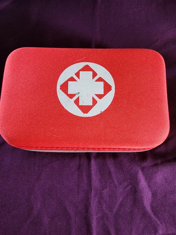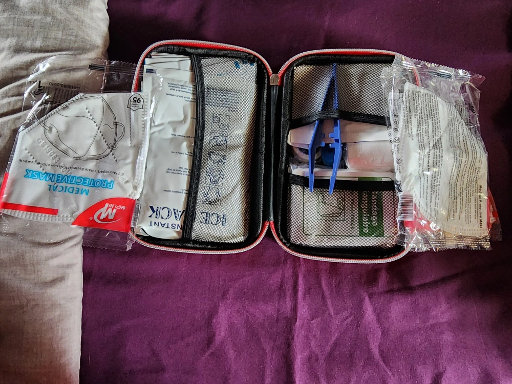 Complete first aid kit, perfect for home, car, or travel! It includes various medical supplies such as bandages, antiseptic wipes, an instant ice pack, and protective masks. Everything is neatly organized in a compact, red carrying case.