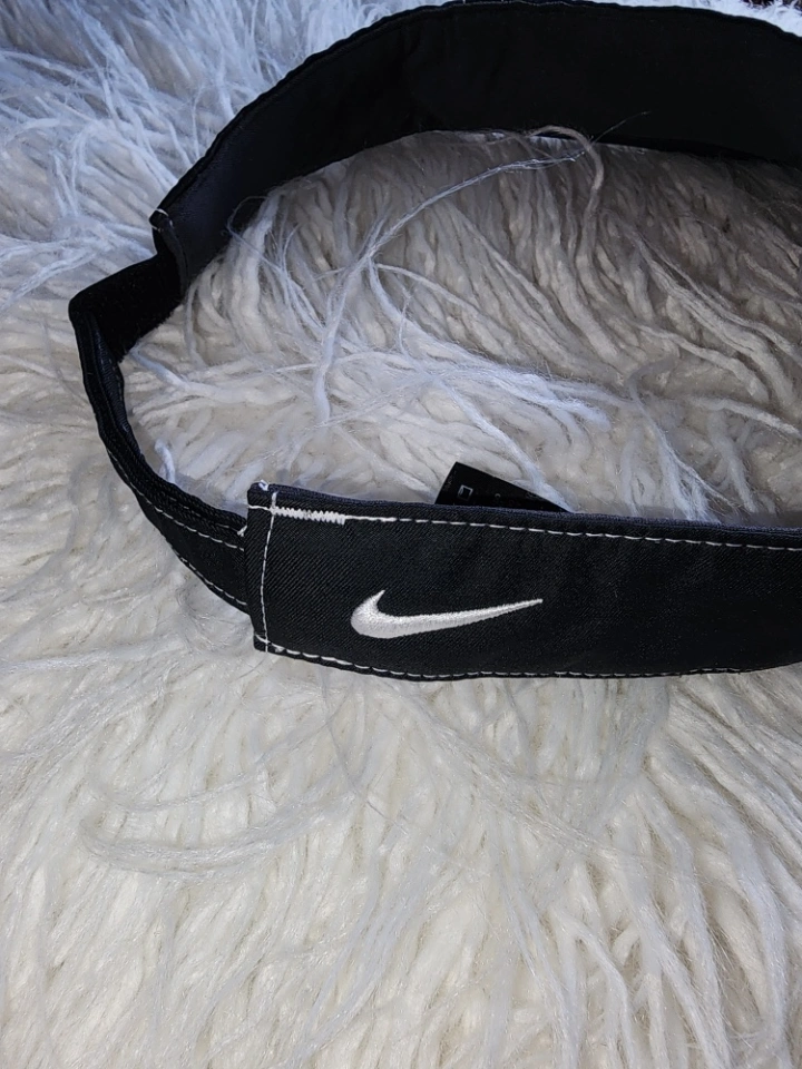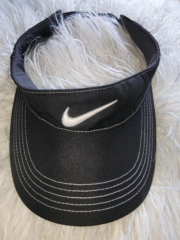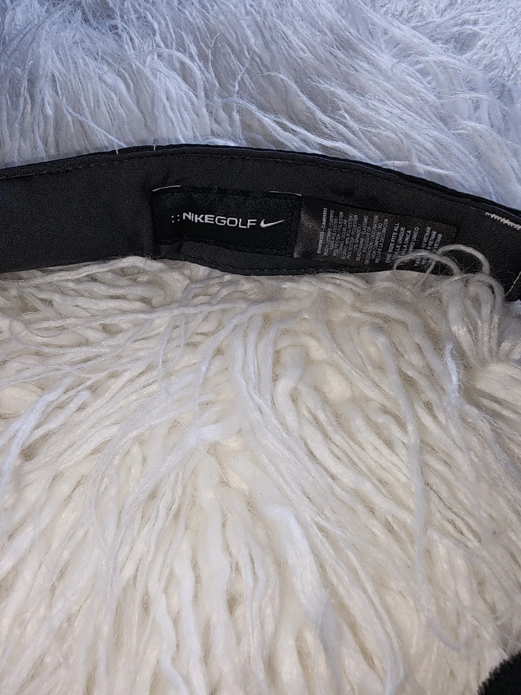 This is a Nike Golf visor in black and stitched. It's in great condition and ready for the golf course or any sunny day. The visor features the iconic Nike swoosh logo. Perfect for keeping the sun out of your eyes while looking stylish!