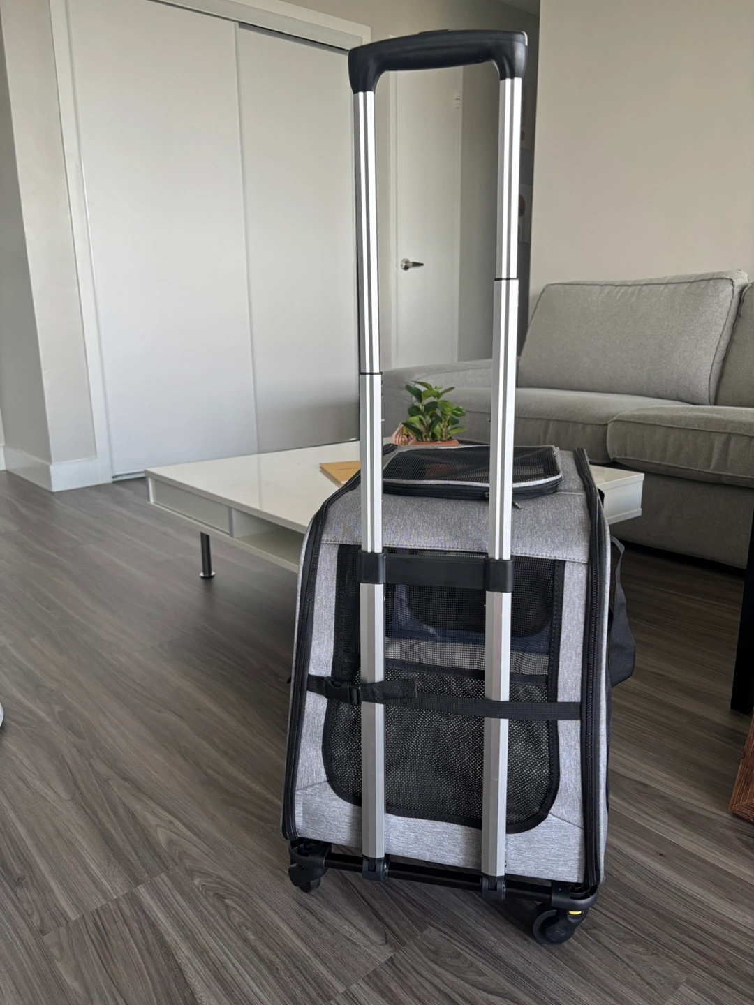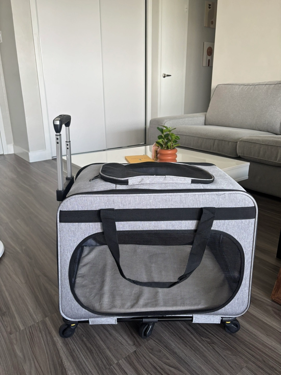 Selling a brand new grey pet carrier with wheels. It'sready for your furry friend's adventures! Perfect for travel or vet visits, it's easy to maneuver and provides a comfortable space for your pet