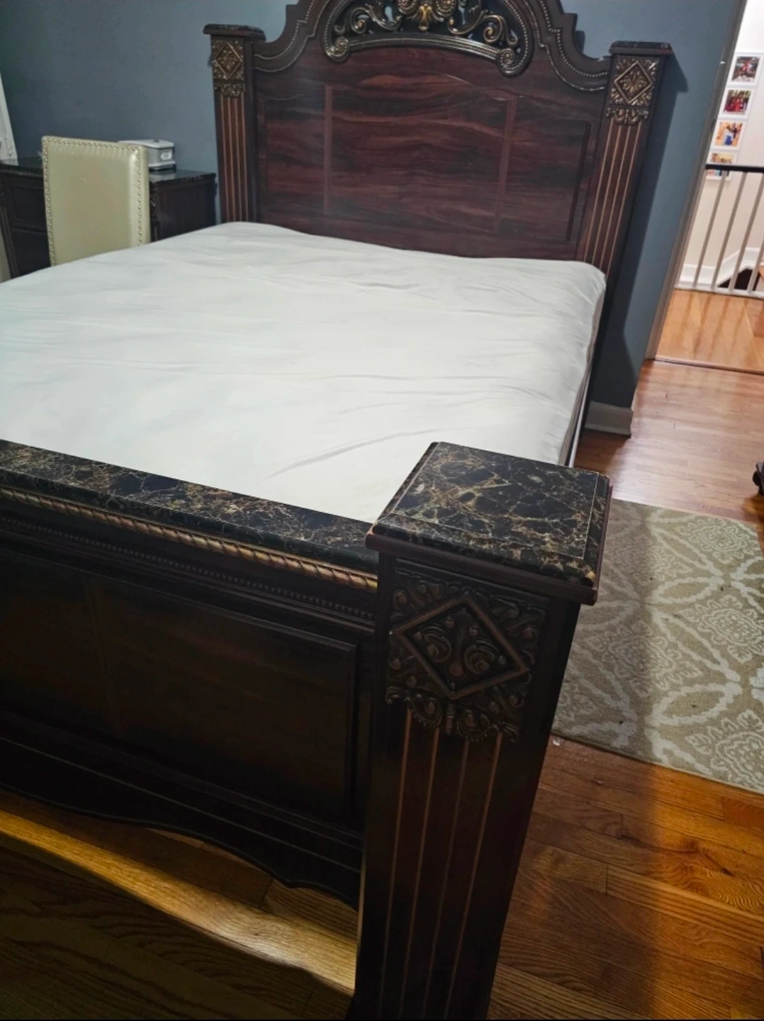 Beautiful dark wood bed frame with ornate carved details and marble-like accents on the posts. Includes headboard and footboard. Adds a touch of classic elegance to any bedroom. This bed frame is perfect for a master suite or guest room. Comes with free full size mattress