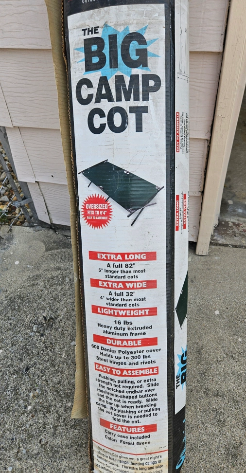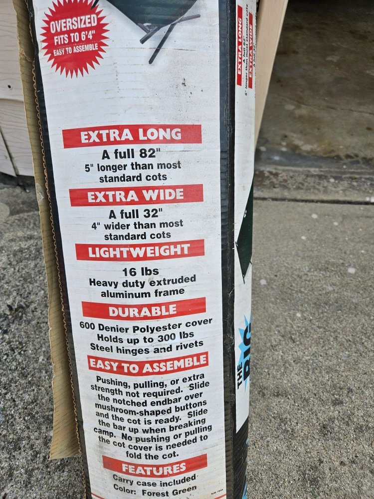 Selling a Big Camp Cot! It's extra long and wide, ensuring a comfortable night's sleep. Key features: - Extra Long: A full 82", 5" longer than most standard cots - Extra Wide: A full 32", 4" wider than most standard cots - Lightweight: 16 lbs with a heavy-duty extruded aluminum frame - Durable: 600 Denier Polyester cover that holds up to 300 lbs - Easy to assemble: No pushing or pulling is needed to fold the cot - Carry case included - Color: Forest Green