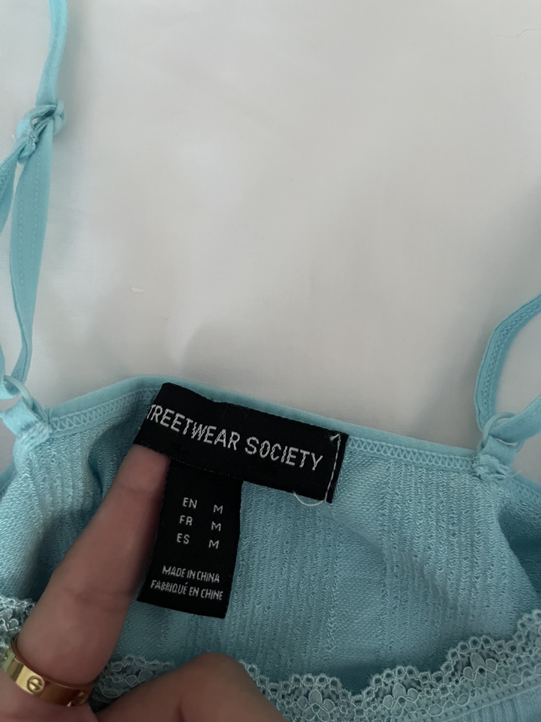 This is a light blue tank top from Streetwear Society in size M. It's in perfect condition and ready for a new home! The fabric has a ribbed texture, and there's a cute lace trim along the neckline and bottom