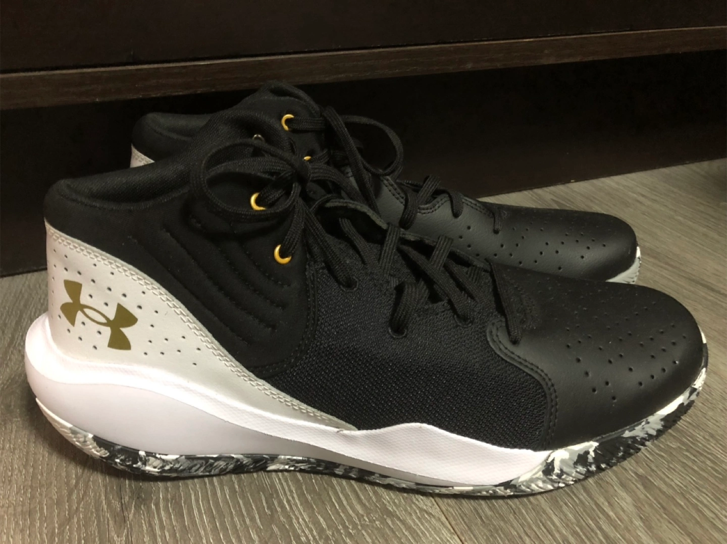 Under Armour sneakers in black and white. They look great for playing ball or just kicking around town!