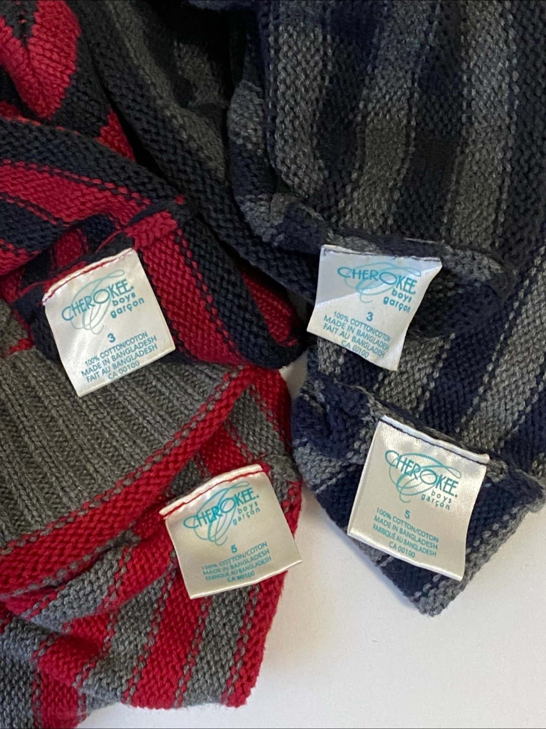 I have some cute Cherokee boys' knit hats available! There are two hats in size 3 and two in size 5. They are made of 100% cotton.