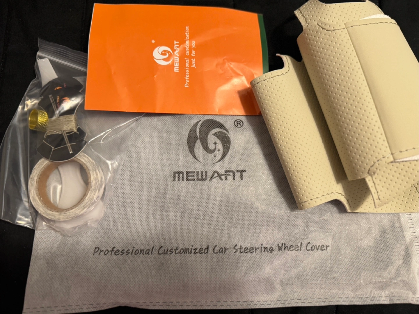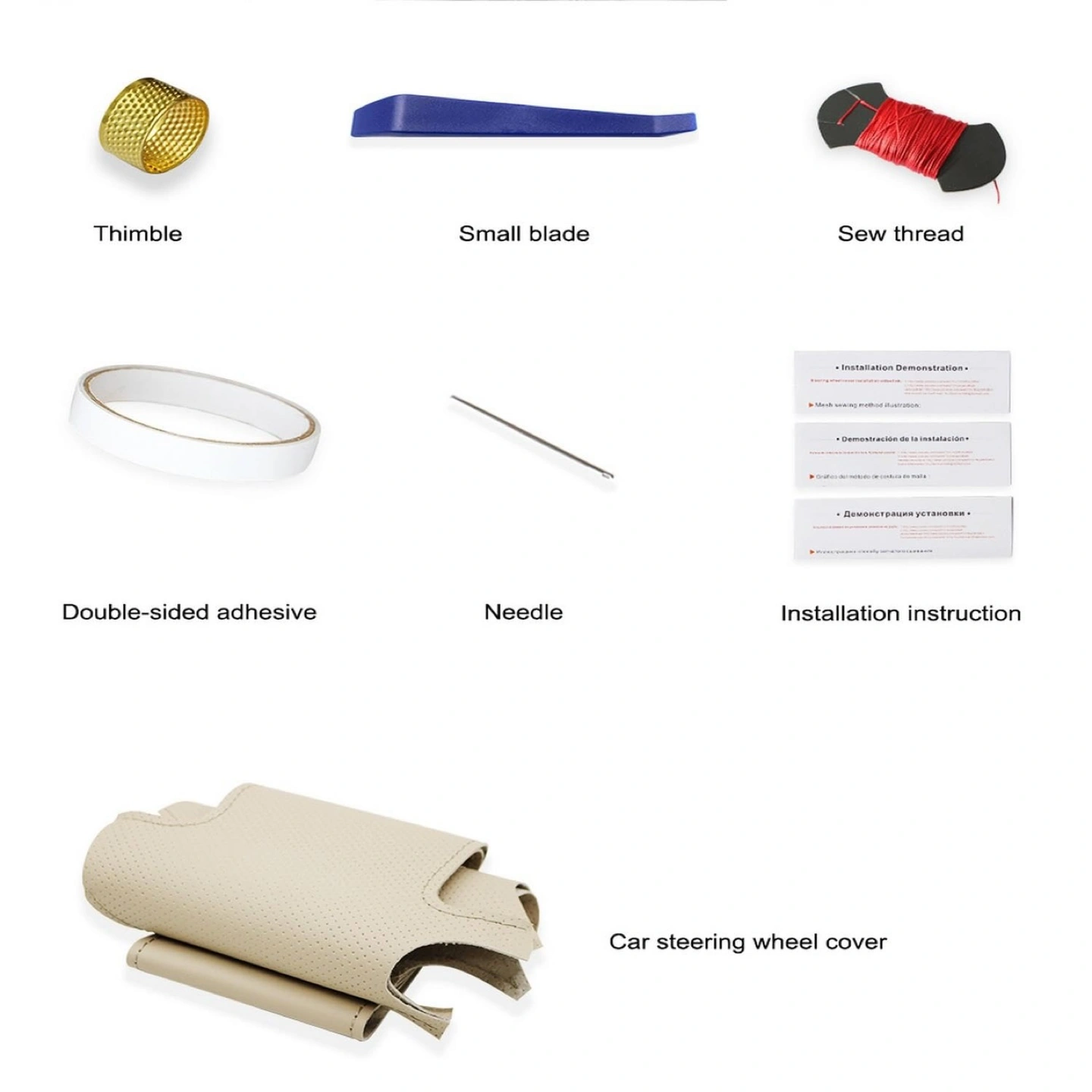 I'm selling a brand new MEWANT car steering wheel cover! It's a professional customized car steering wheel cover. Included are double-sided tape, a small blade, a needle, sew thread, a thimble, and installation instructions