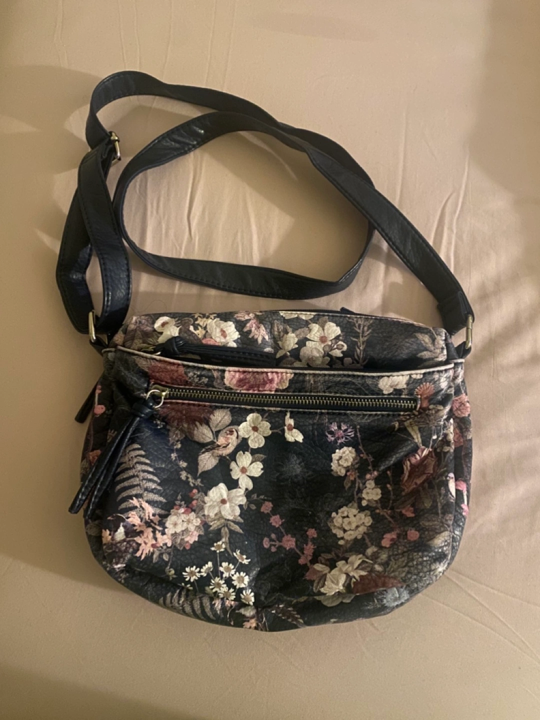 Cute floral crossbody bag! It's in good condition and perfect for everyday use. The bag has a zipper closure and an adjustable strap for comfortable wear. Color on the back shows some wear.