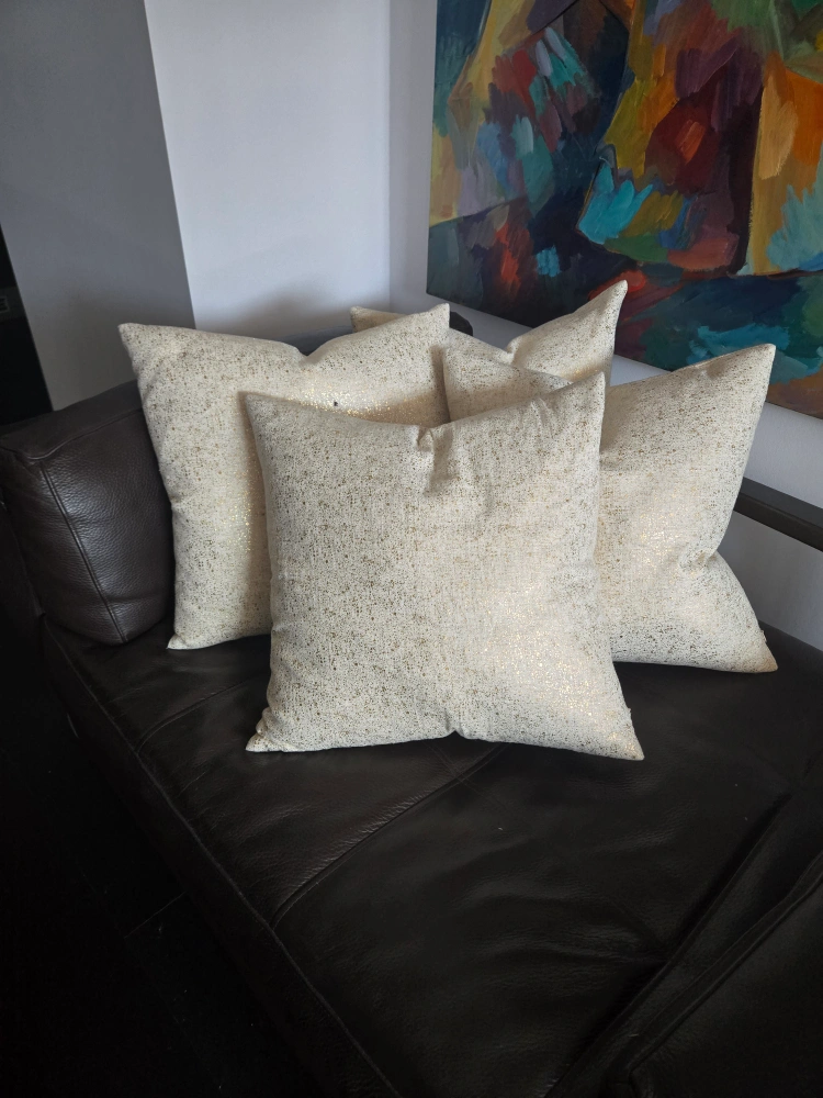 Four Beautiful decorative throw pillows for sale - Like New!. They have a neutral colour with gold flecks throughout the fabric. They're in great condition and would look great on a couch or bed!