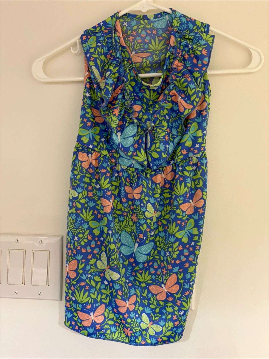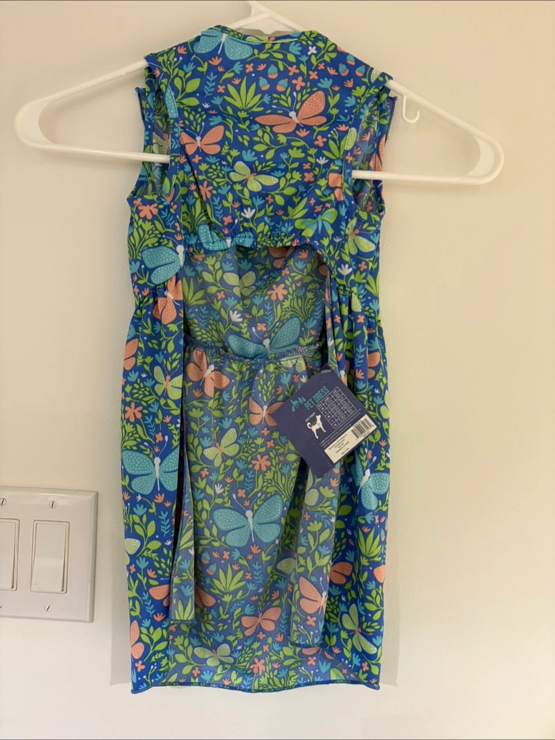 This PetRageous Outwear dress is a cute addition to your pet's wardrobe! It features a vibrant butterfly and floral pattern on a blue background. The dress is a size large and perfect for a tall medium built pup. My precious female companion did not even want to try it on. ๐ itโs new and free