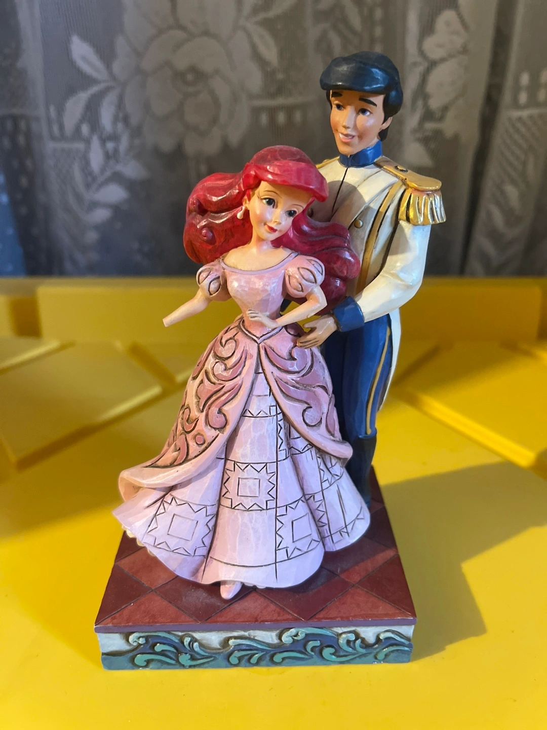 Selling a charming Disney Traditions figurine by Jim Shore, titled "A Perfect Fit" featuring Ariel and Prince Eric. This piece captures a beautiful moment between the characters with Jim Shore's signature folk art style. It's in great condition and would make a lovely addition to any Disney collection