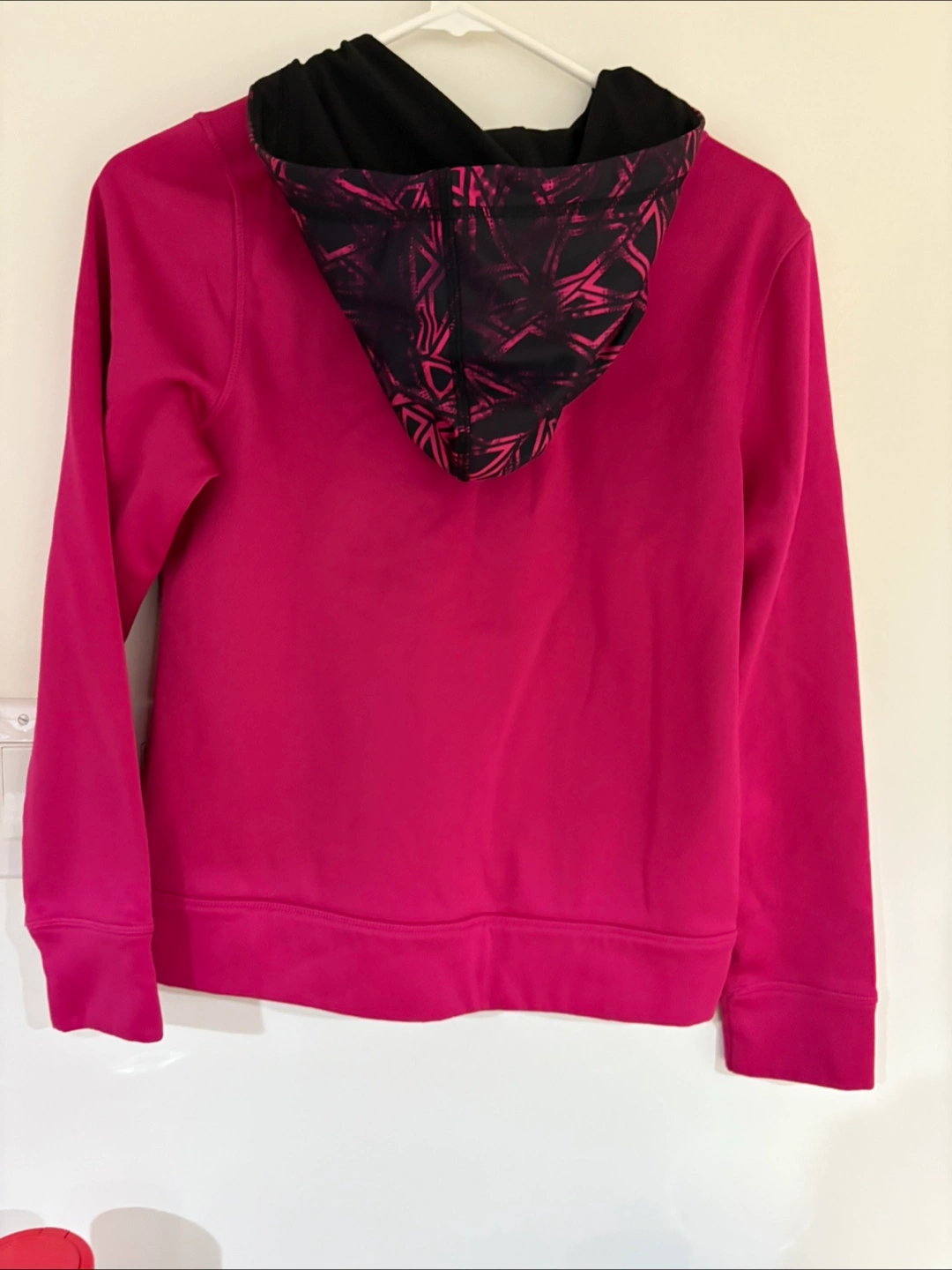 Giving away a pink athletic hoodie with a black and pink patterned hood lining and side panels. It's in great shape and ready for a new home! Size is large