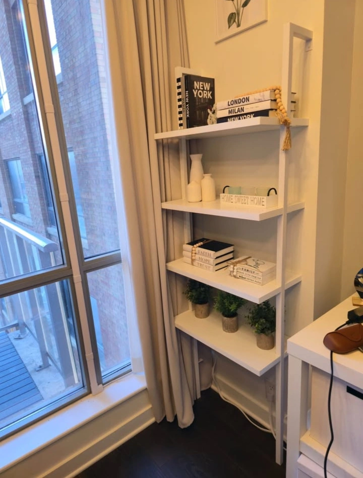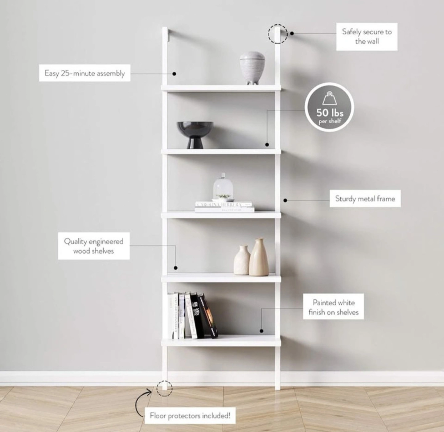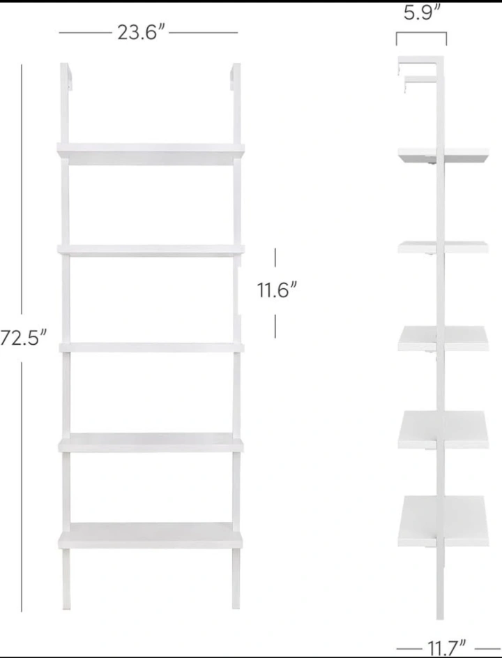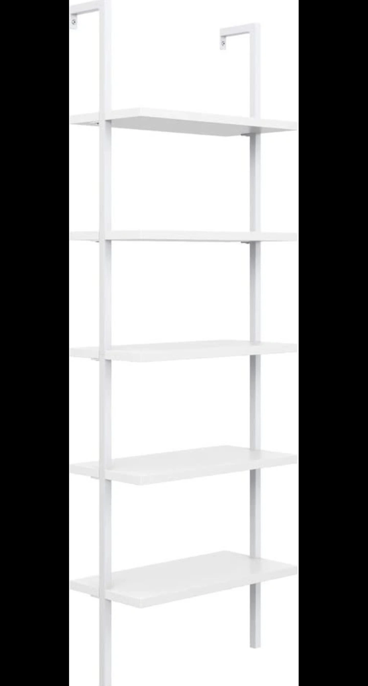 Crafted with a sturdy white metal frame and durable white engineered wood shelves, each tier supports up to 50 lbs. With five open shelves, it’s ideal for offices, living rooms, or modern studios. Its wall-mounted ladder style gives you both stability and a floating look. Super easy to assemble in about 25 minutes, even if you’re not handy.
