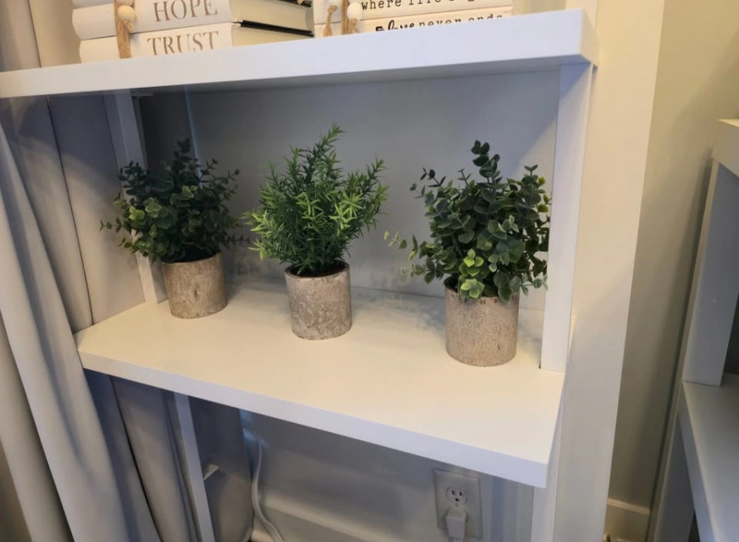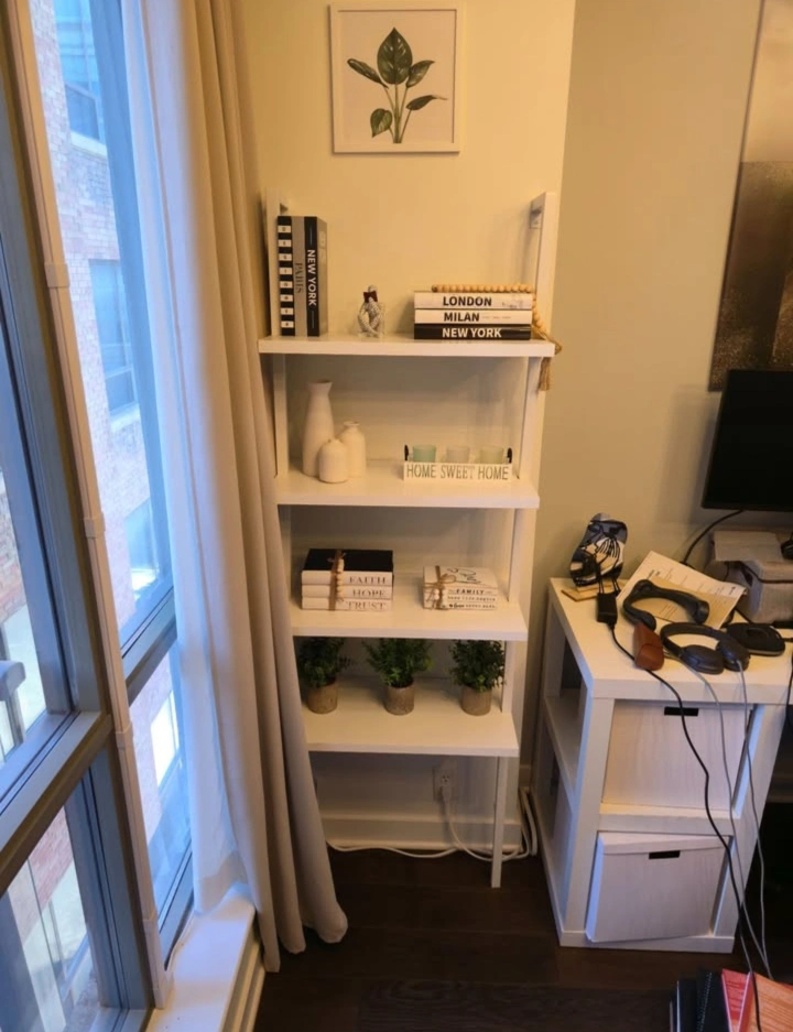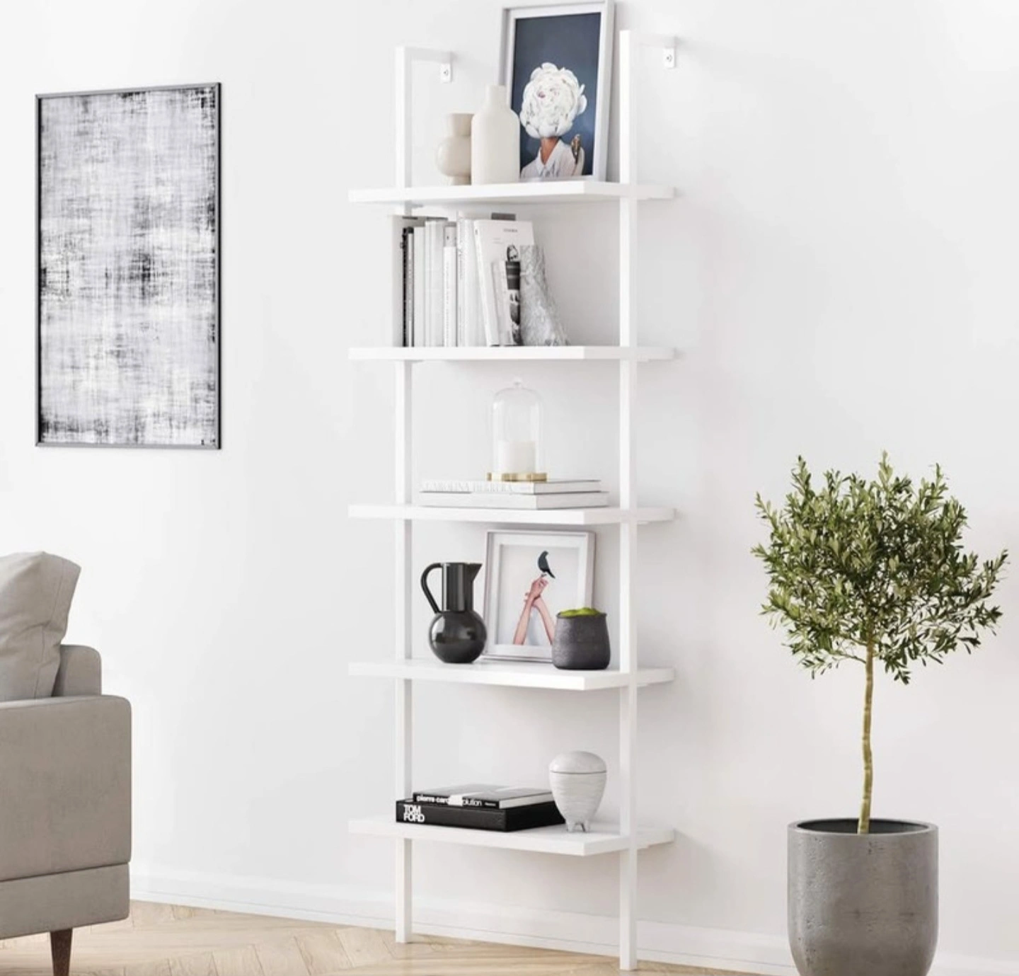 Crafted with a sturdy white metal frame and durable white engineered wood shelves, each tier supports up to 50 lbs. With five open shelves, it’s ideal for offices, living rooms, or modern studios. Its wall-mounted ladder style gives you both stability and a floating look. Super easy to assemble in about 25 minutes, even if you’re not handy.