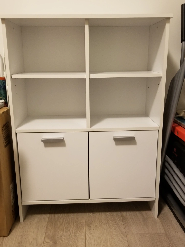 Here's a handy white storage cabinet! It features open shelving up top and two doors at the bottom, perfect for organizing your space. It's in great shape and ready for a new home!