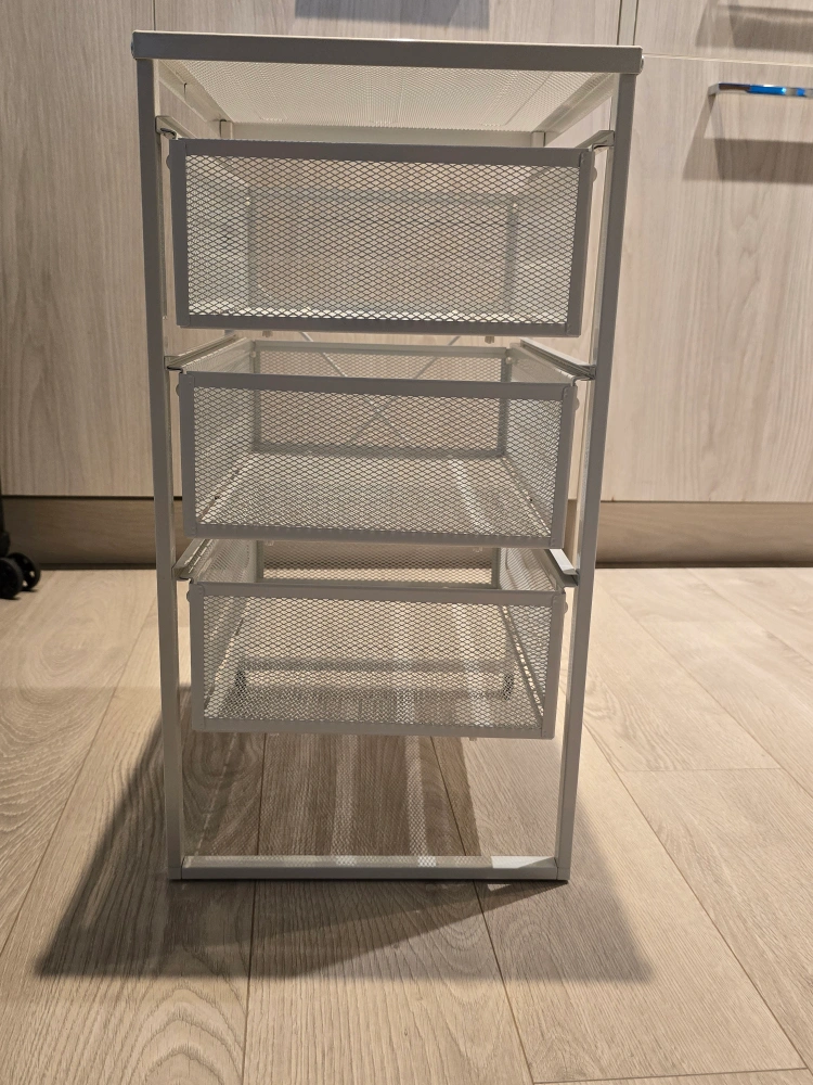 Looking to declutter? I'm selling a handy white metal mesh storage unit with three drawers. It's perfect for organizing small items in your closet, bathroom, or office. It's in great shape and ready for a new home!