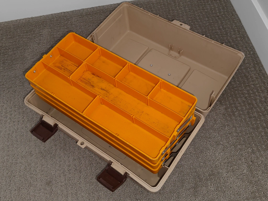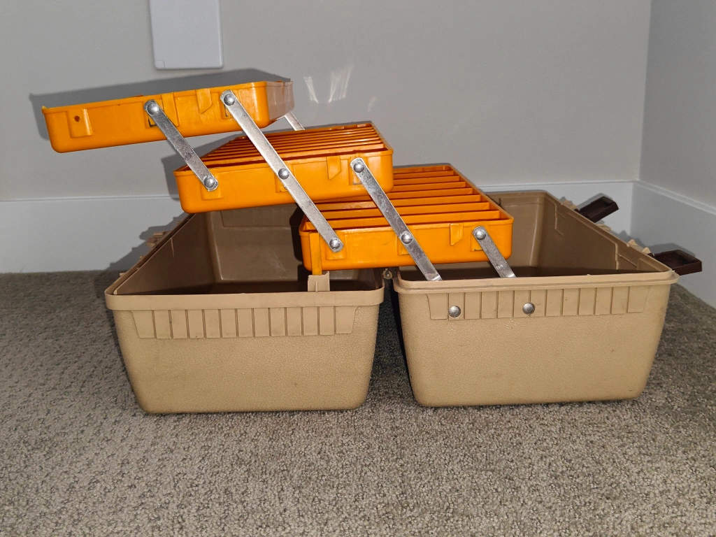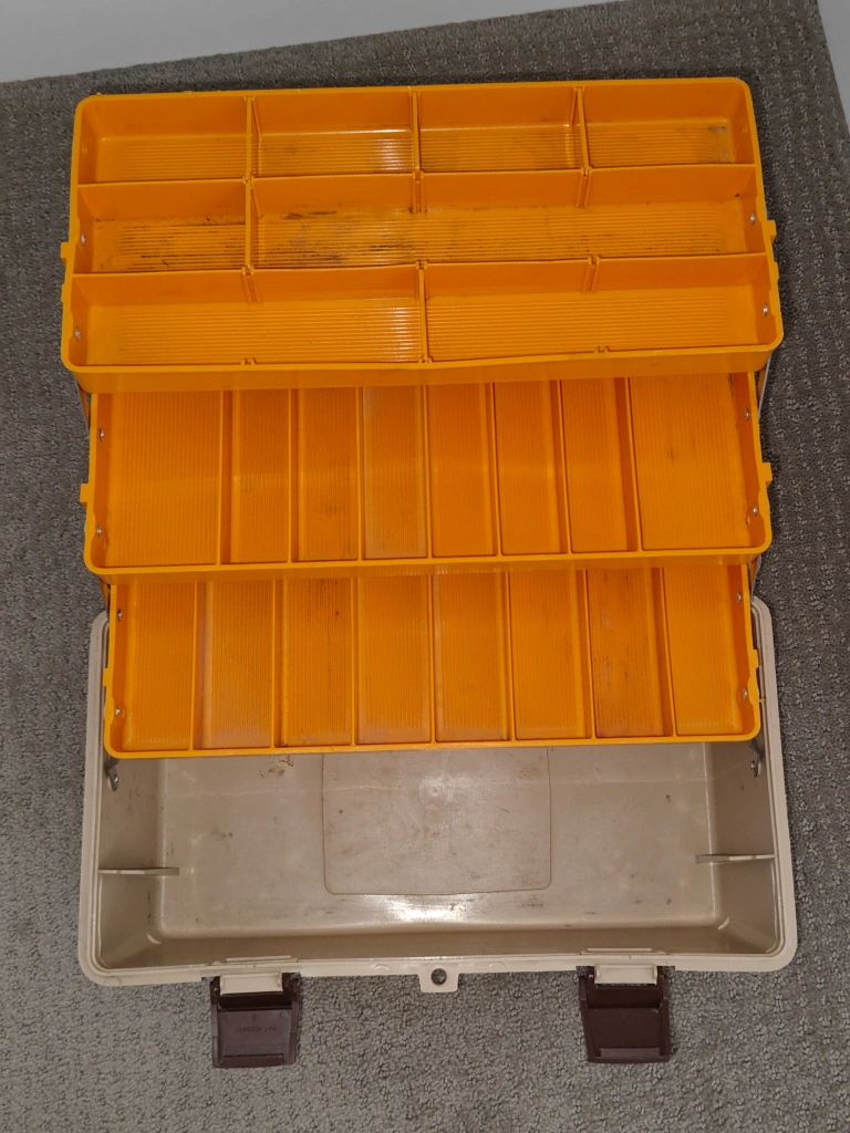 Made of durable plastic, this box shows the typical signs of a life well-lived, including minor surface wear and some light staining inside the trays, as you can see in the photos. There are no cracks or major damage, and the latches are fully functional and secure. The robust design keeps your gear neatly organized and protected, so everything stays where it belongs.