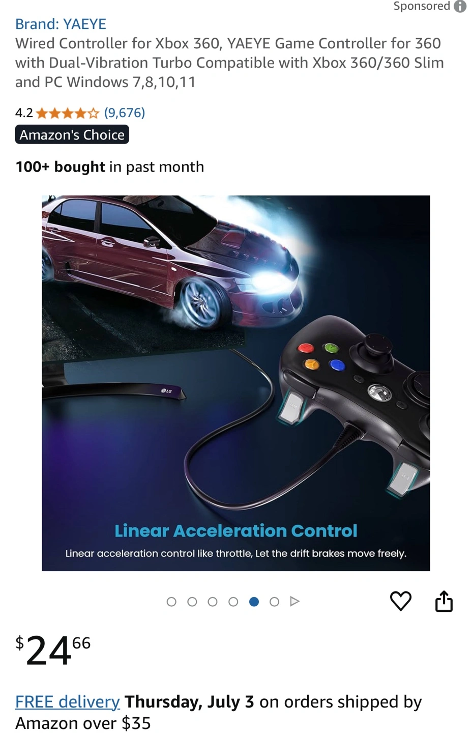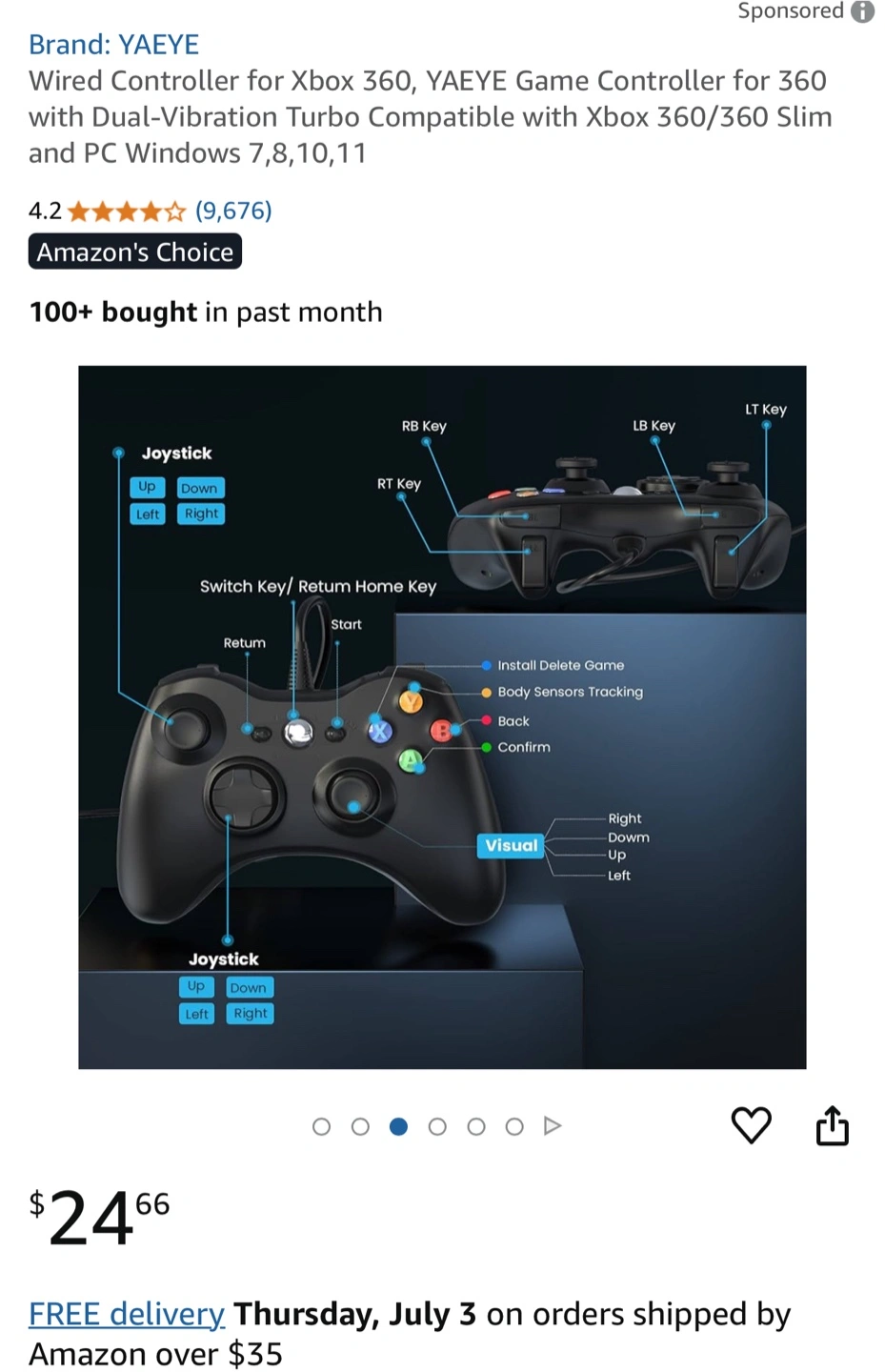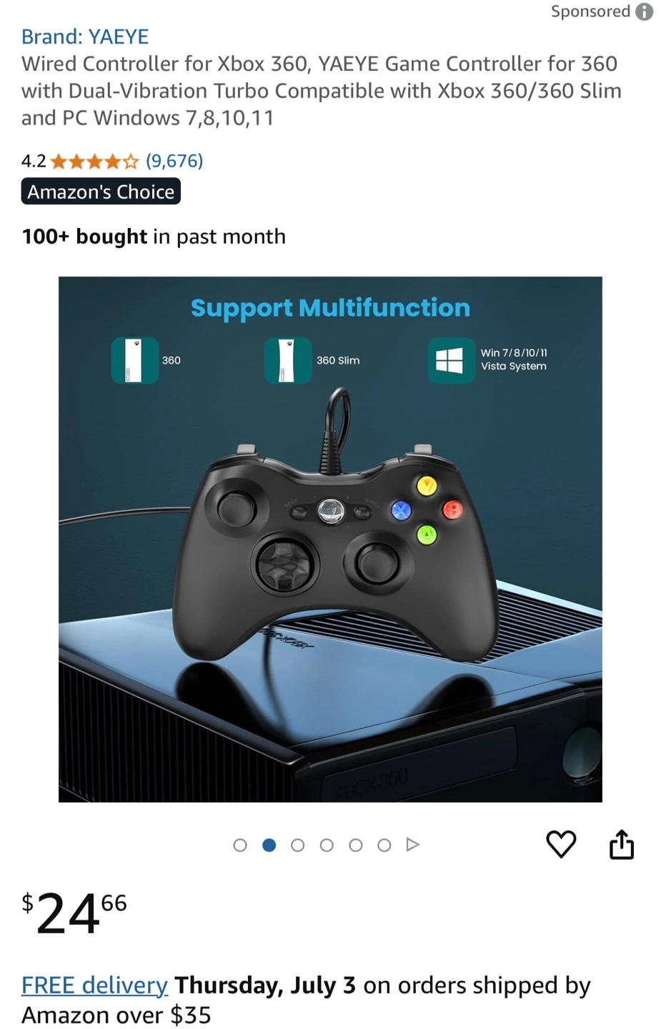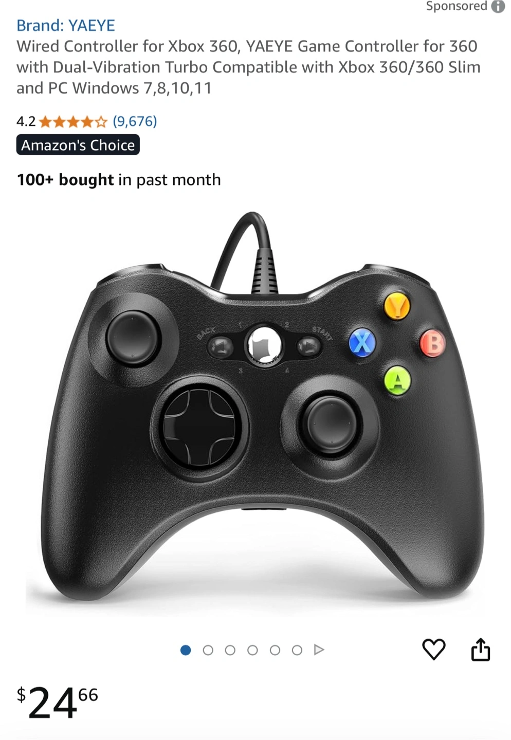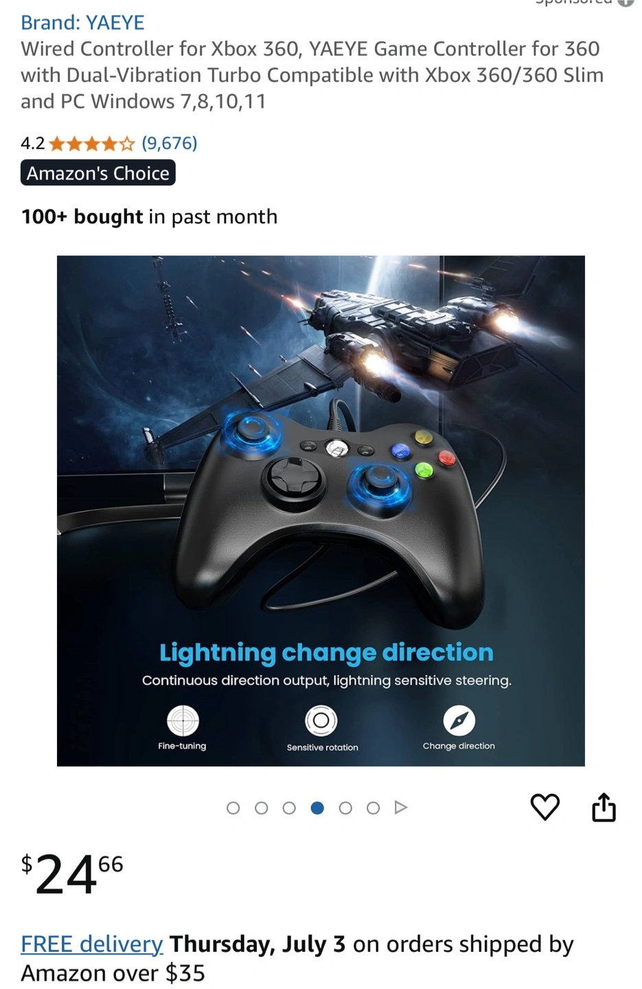Selling a YaeYe wired controller for Xbox 360. It's compatible with Xbox 360/360 Slim and PC Windows 7, 8, 10, and 11. It features dual-vibration turbo for an enhanced gaming experience.
