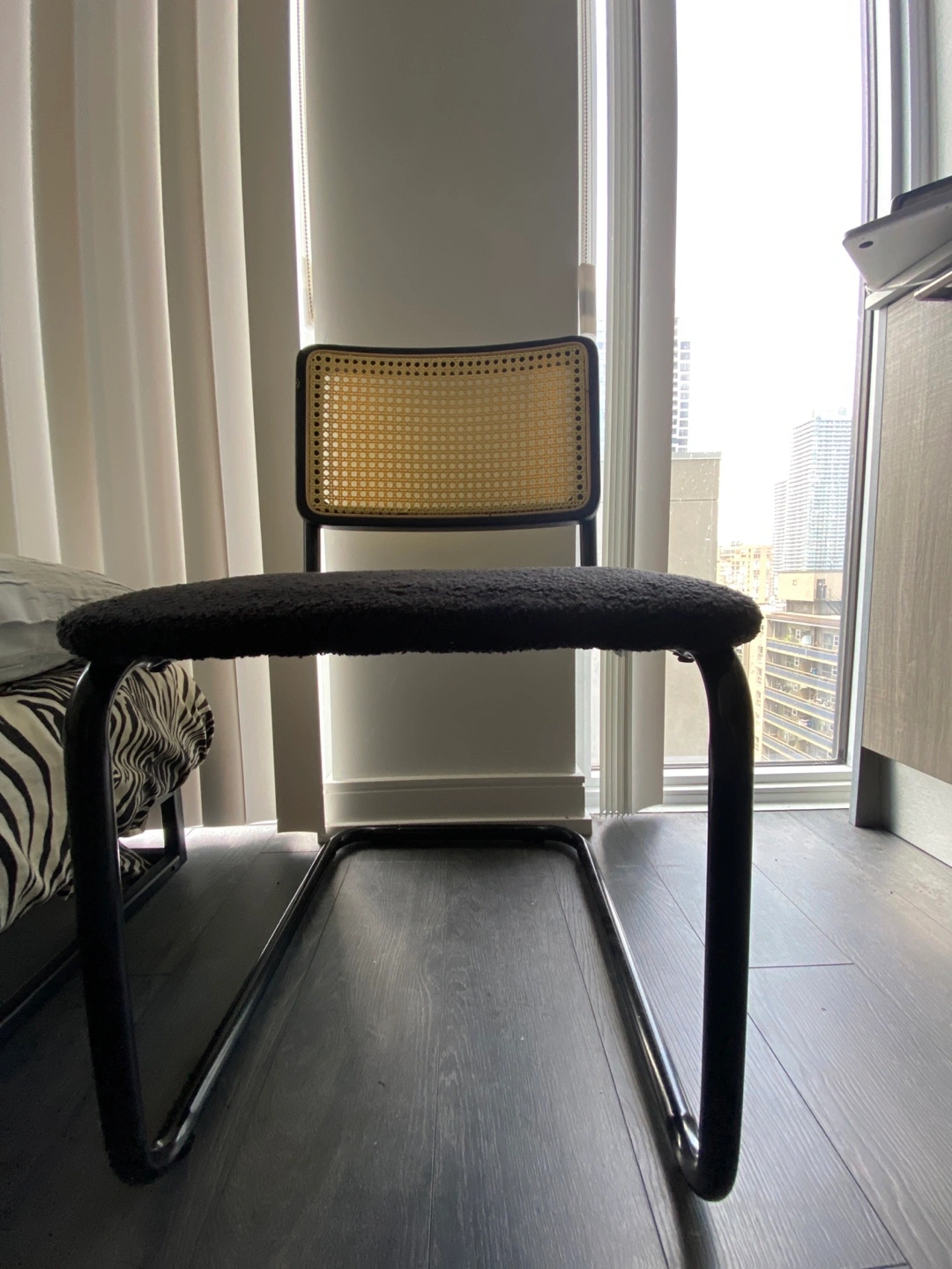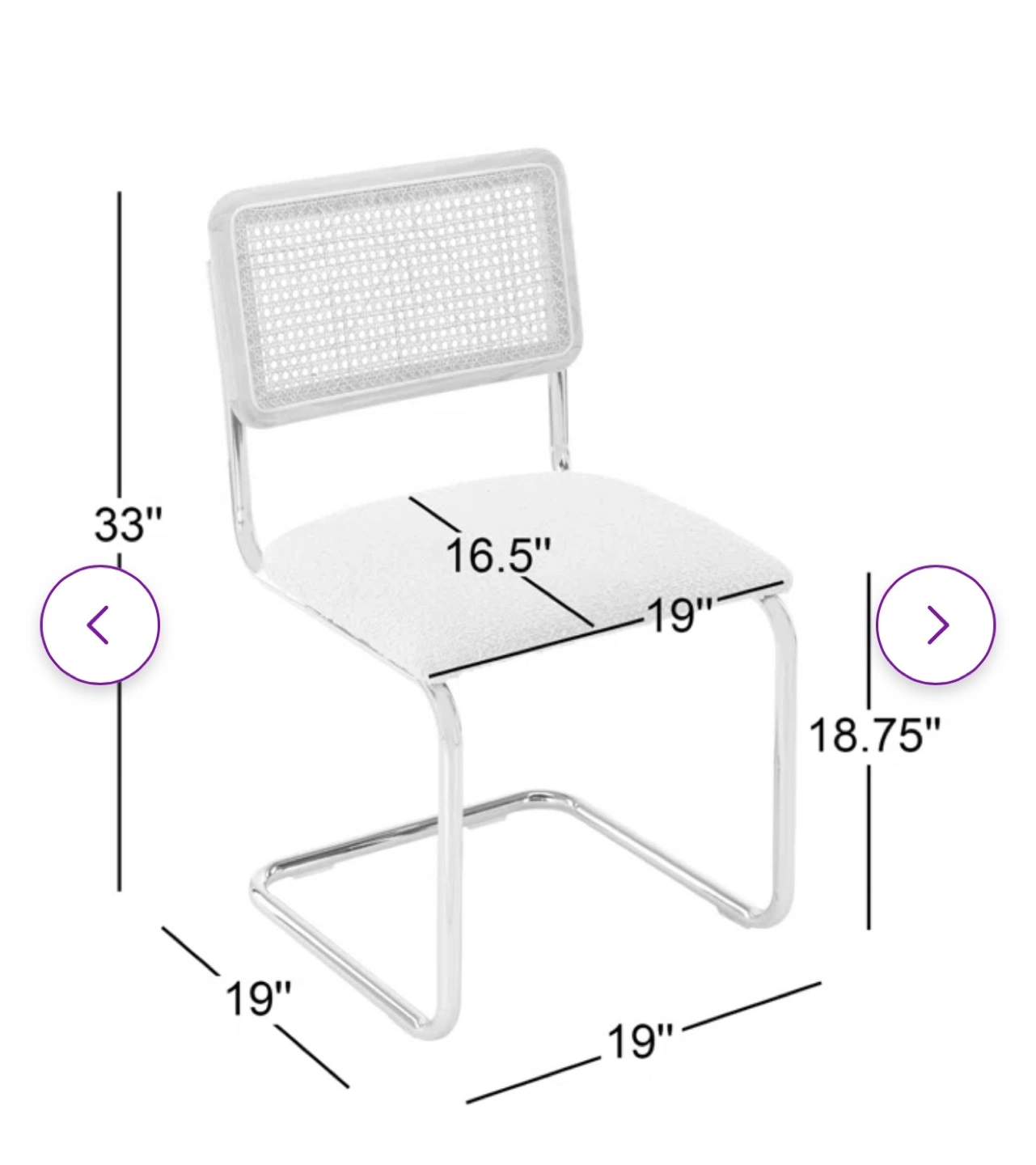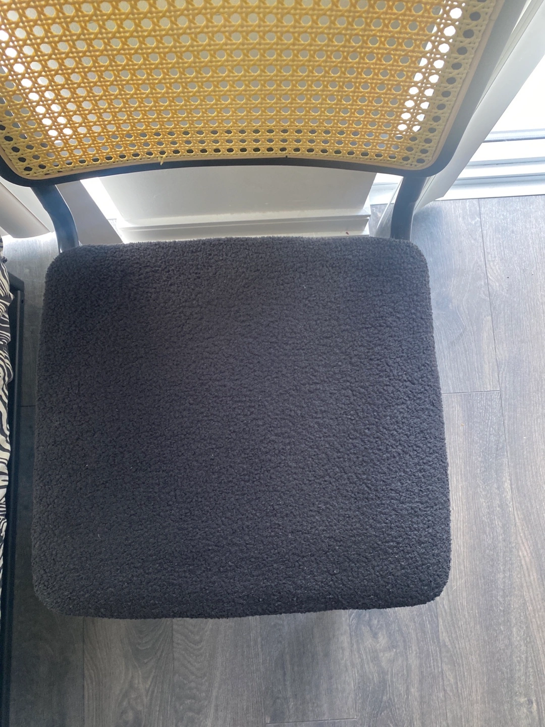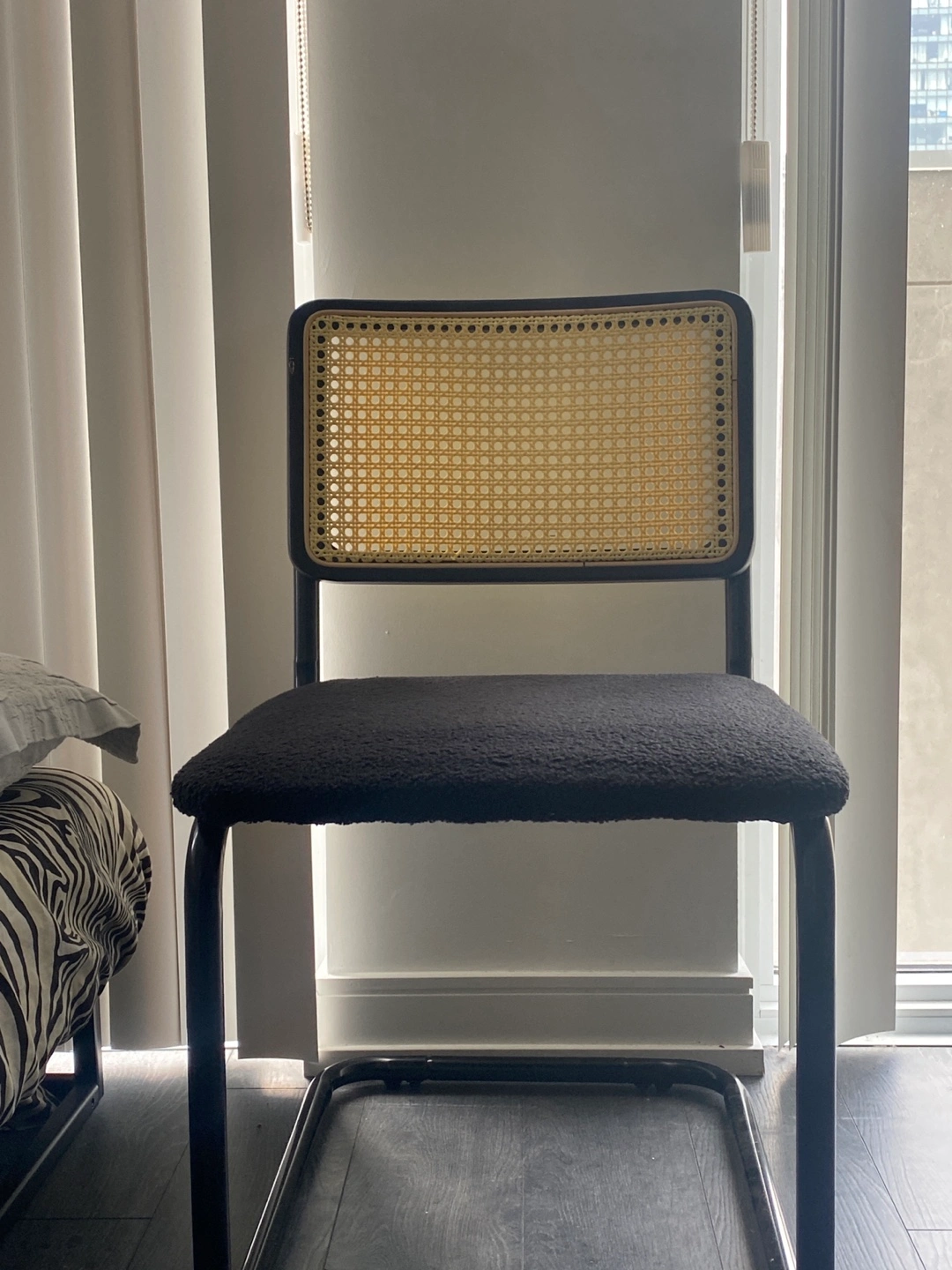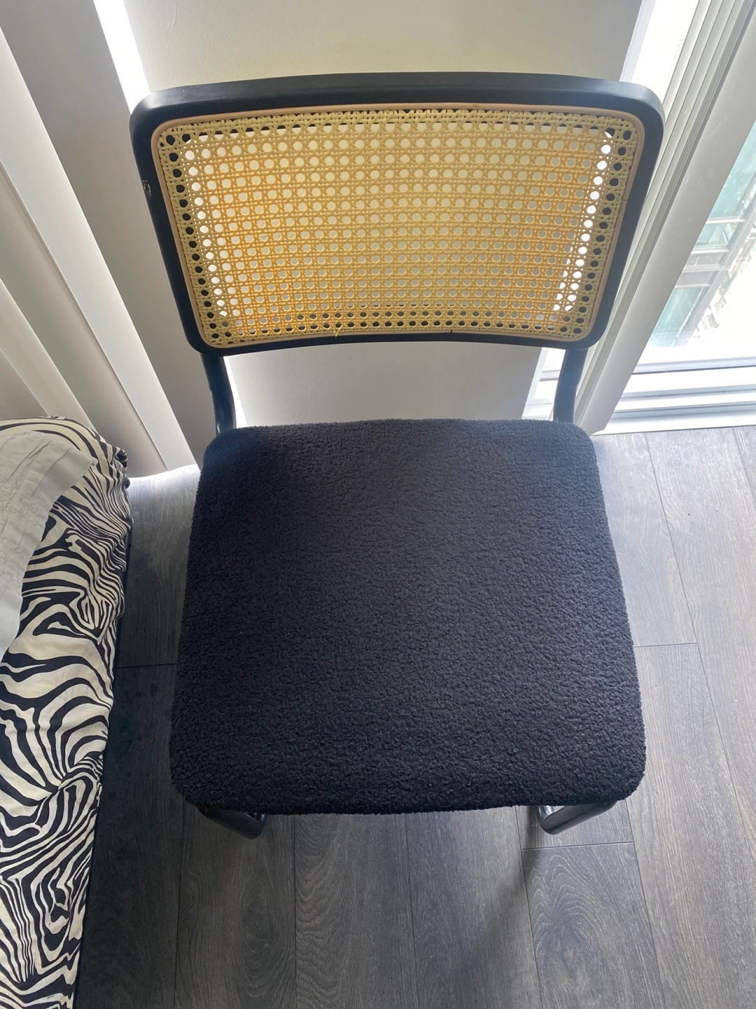Selling 4 AllModern Walsh Boucle Side Chair. This chair features a black frame with a woven cane back and a comfy boucle seat. Originally bought for $689 a chair two weeks ago and used for staging only. Price is per chair