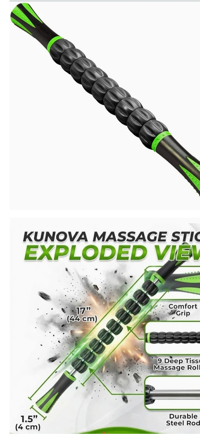 This Kunova massage stick is 17" long and features 9 deep tissue massage rollers. It has a comfortable grip and a durable steel rod. Ideal for muscle recovery and stretching!