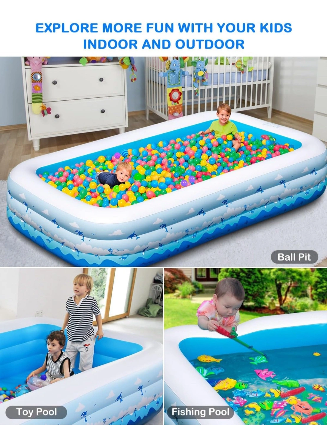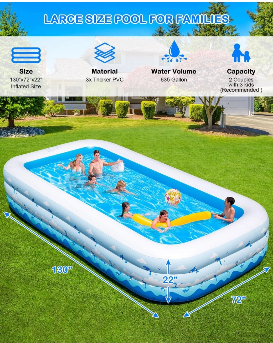 This is a large inflatable family pool by Cinlinso! It's blue and measures 130" x 72" x 22". It's made of 3x thicker PVC and holds 635 gallons of water. Also comes with inflatable pump. It can be used as a ball pit, toy pool, or fishing pool!