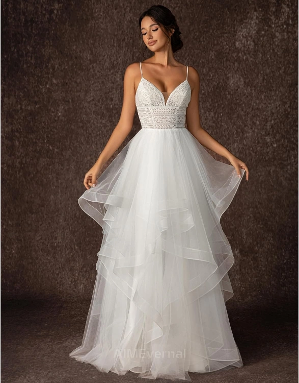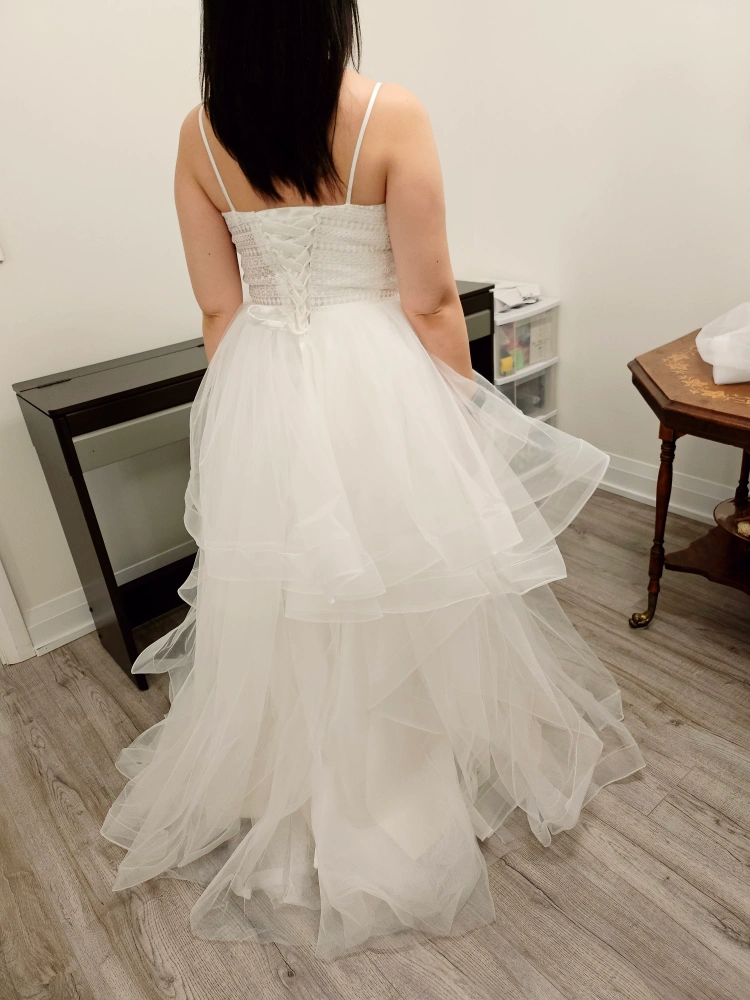 Gorgeous boho wedding dress. Features a lace bodice and layered tulle skirt. Back lace-up closure. Perfect for a Summer beach wedding.