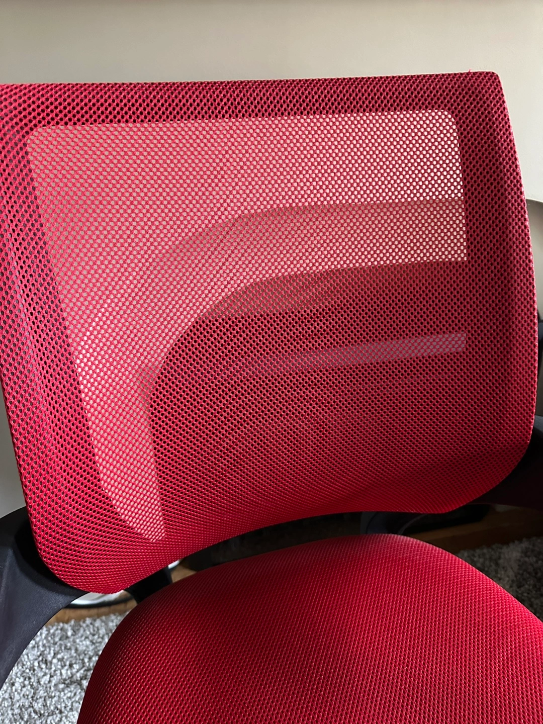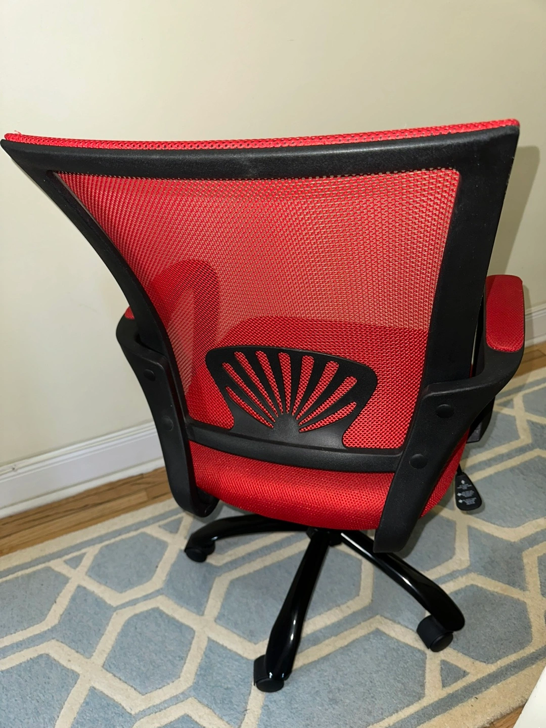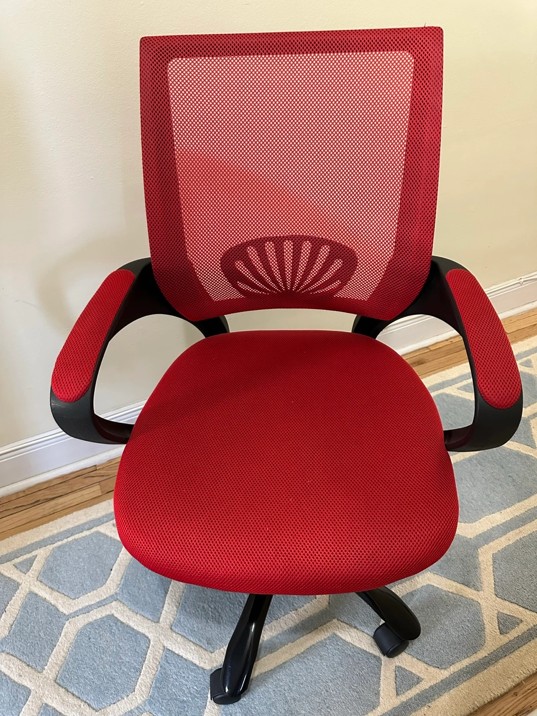 Red and black office chair. 22x35in Lightweight. Had for about 10 years from Amazon. Not used much. Mesh material. Built-in arm rests. 360 degree turn. Adjustable up and down. Wheels work great. Comfortable, sturdy, moves smoothly.