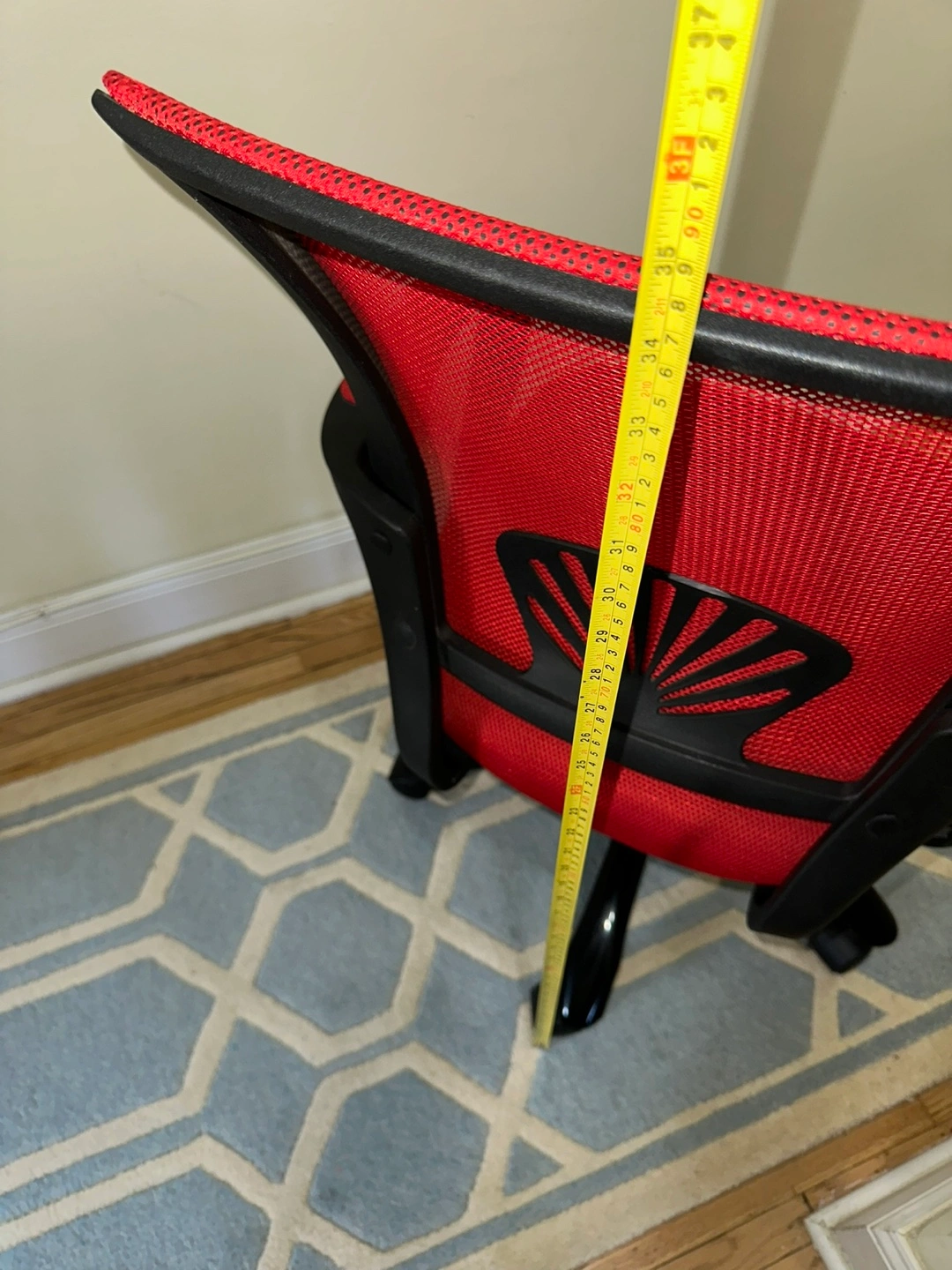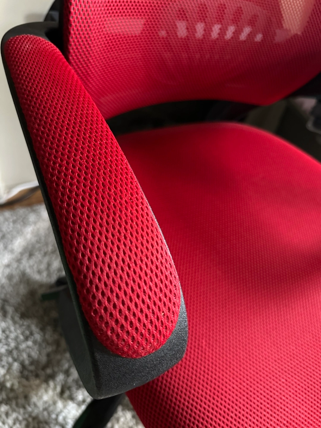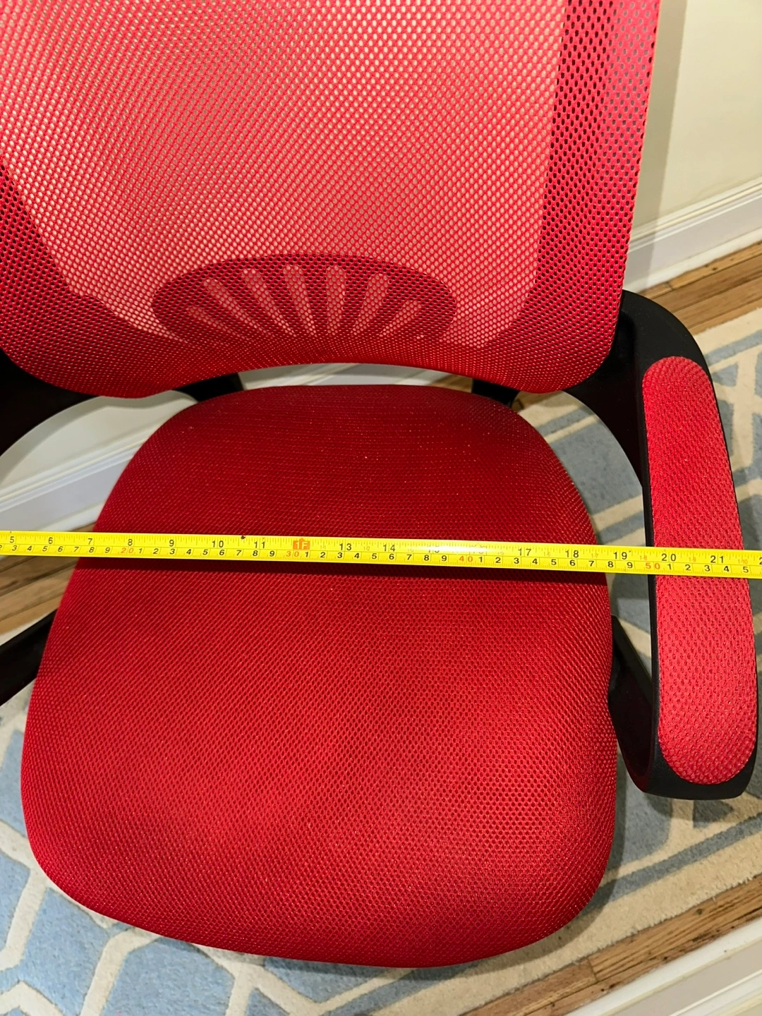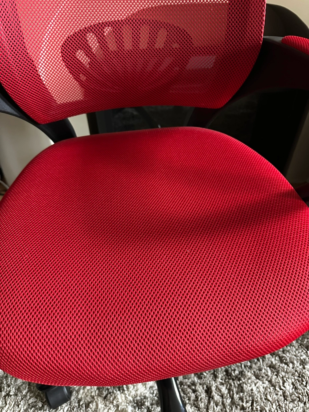 Red and black office chair. 22x35in Lightweight. Had for about 10 years from Amazon. Not used much. Mesh material. Built-in arm rests. 360 degree turn. Adjustable up and down. Wheels work great. Comfortable, sturdy, moves smoothly.