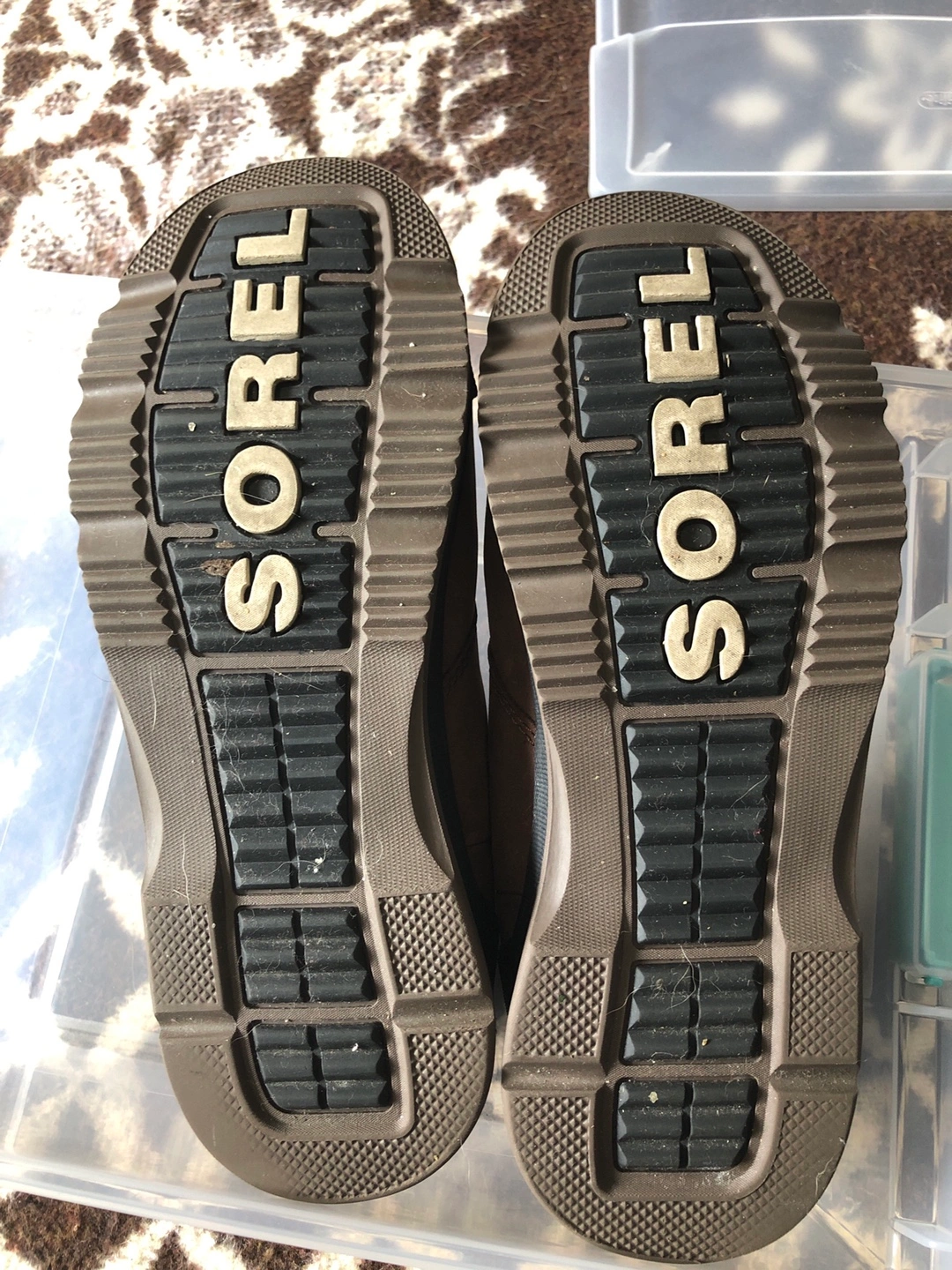 Selling a pair of Sorel ankle boots in brown leather! They're in good condition and ready for a new home. The soles have the Sorel logo on them. Worn 3 times. Not in snow. Stored in Tupperware plastic to minimize damage and keep pristine
