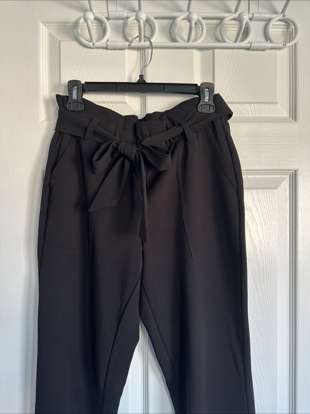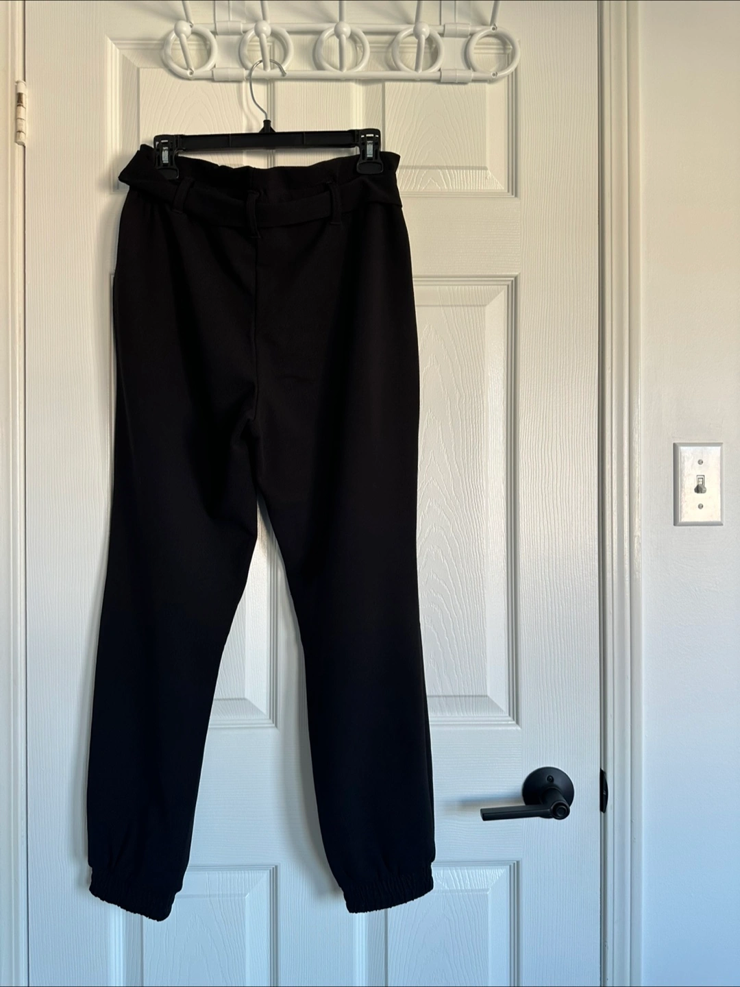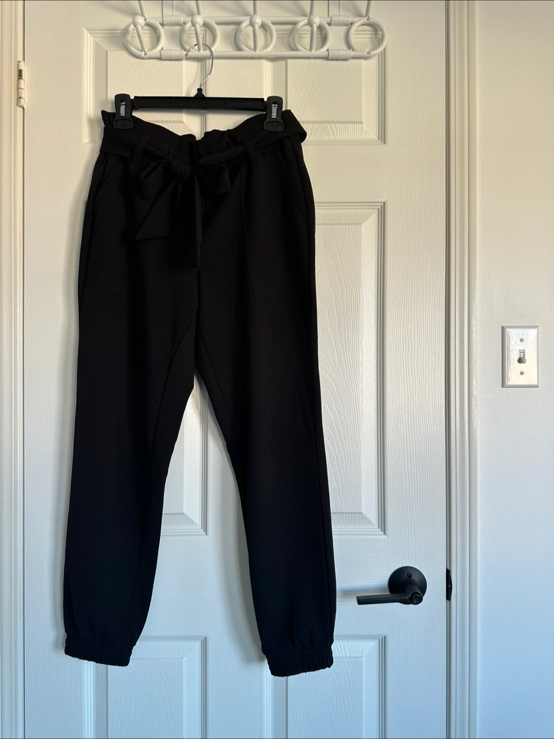 Selling a pair of black jogger pants with a tie-waist detail. They're in great condition and would be a stylish addition to your wardrobe! The material is soft and comfortable, perfect for everyday wear, and lots of stretch.