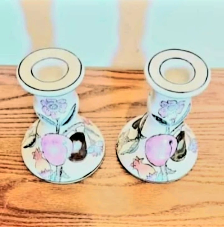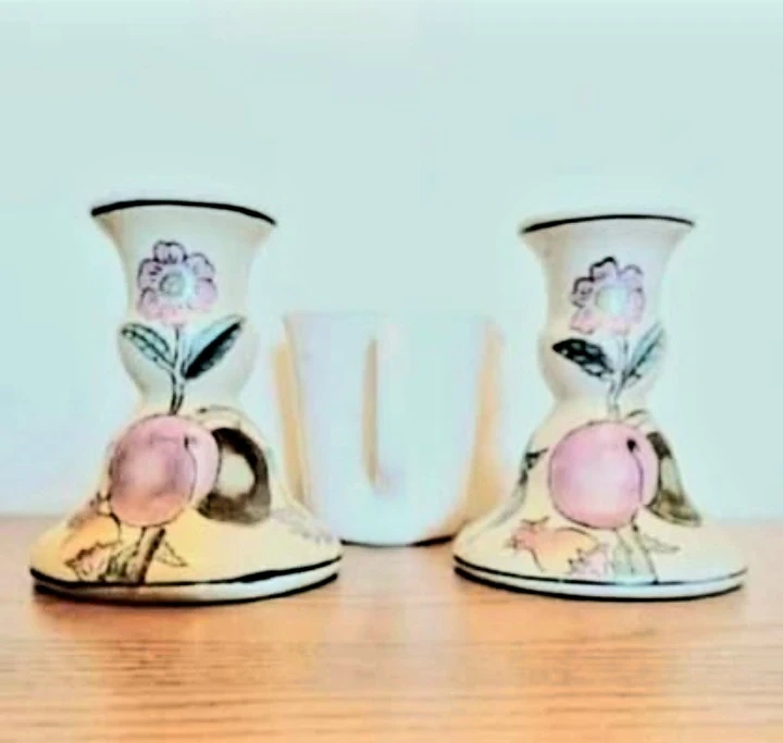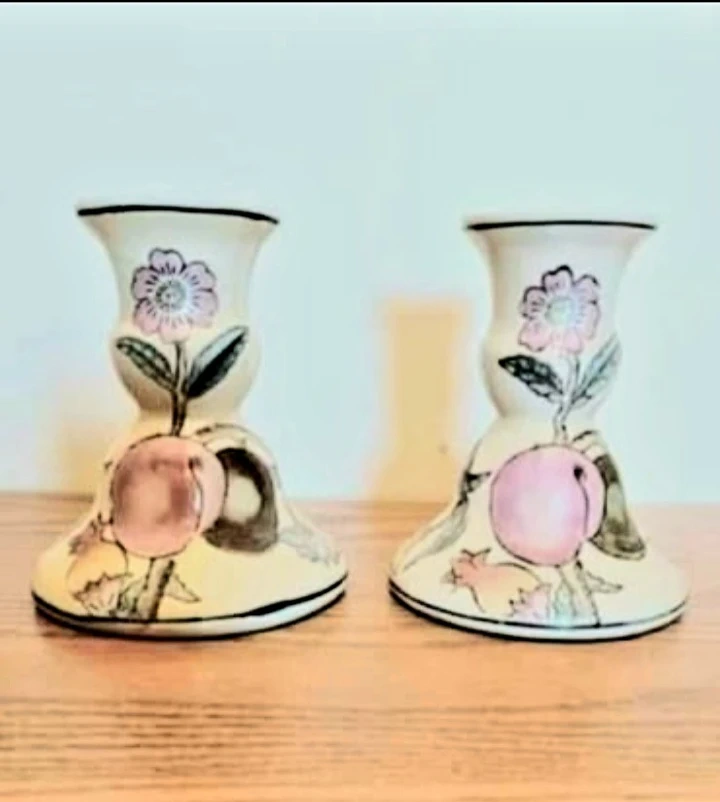 These charming candlestick holders feature a delightful floral and fruit design, adding a touch of vintage elegance to any room. These are used, with slight wear, but they are in excellent condition and ready to bring a cozy ambiance to your space. Perfect for adding a warm glow to your dining table or mantelpiece. The whimsical design is sure to spark conversation and add a unique touch to your home decor.