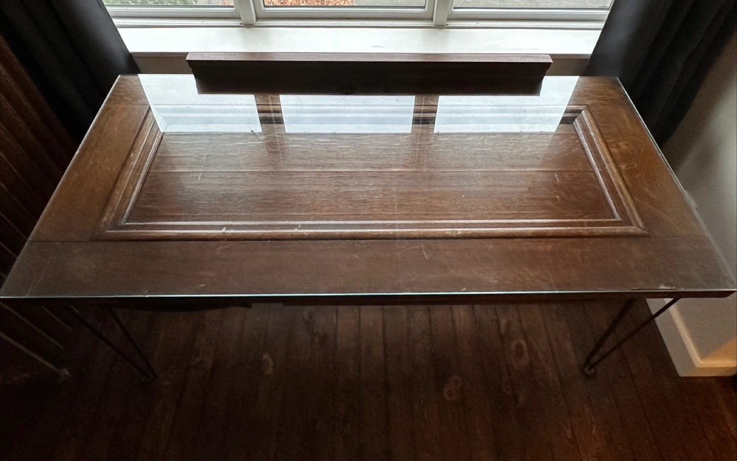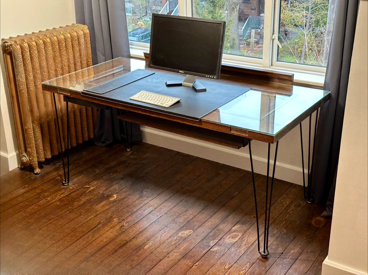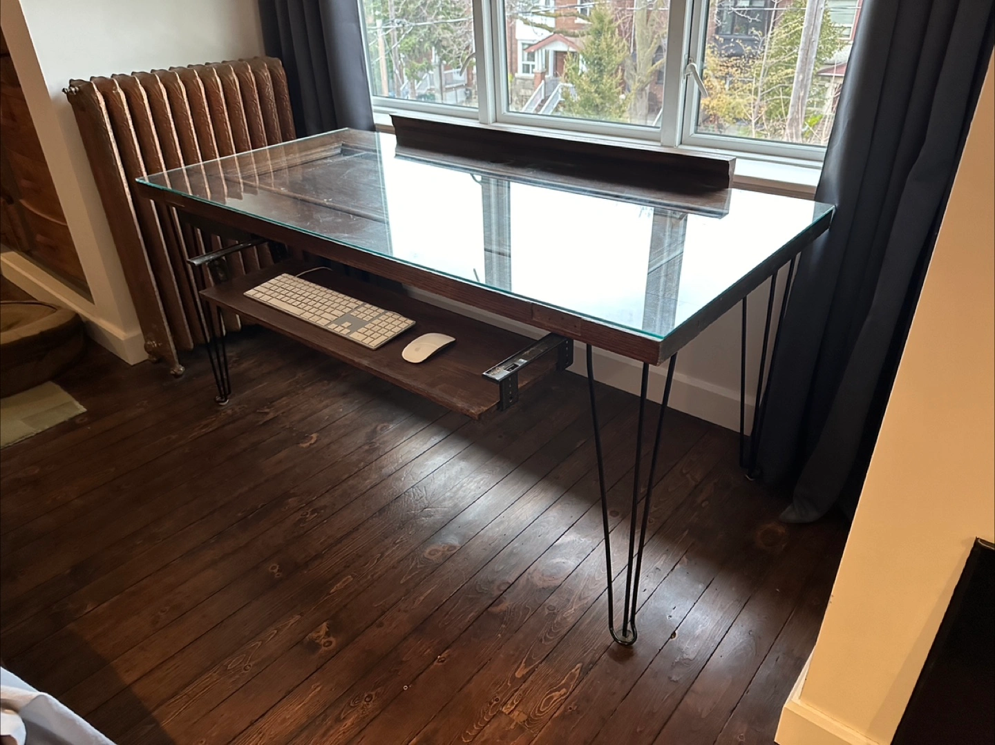Selling a unique desk with a glass top and a wooden base! The door was from an old home and was a mini basement or closet door. Original finish. It features stylish hairpin legs and a wide pull-out keyboard tray.