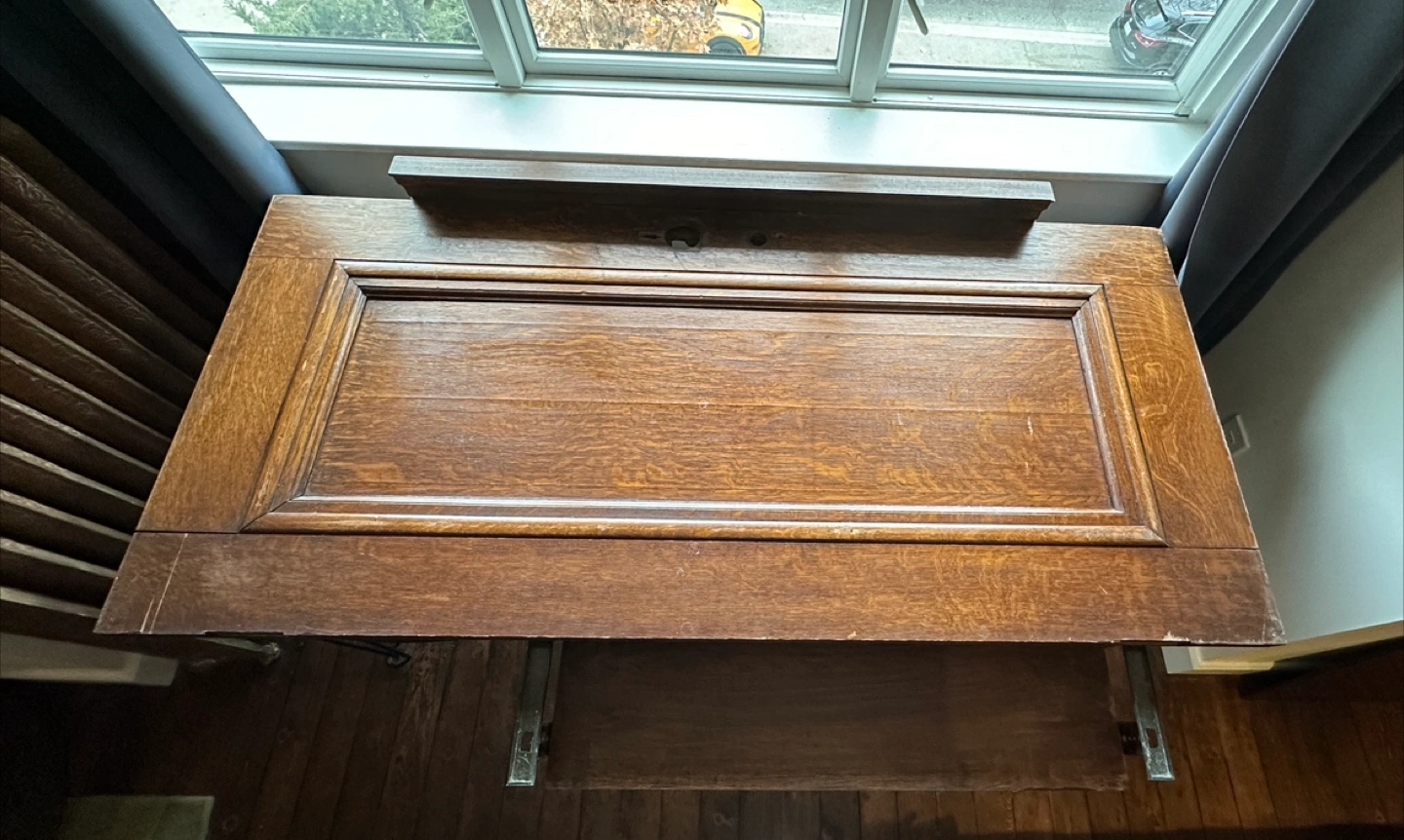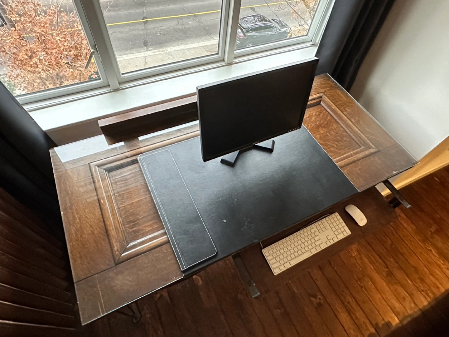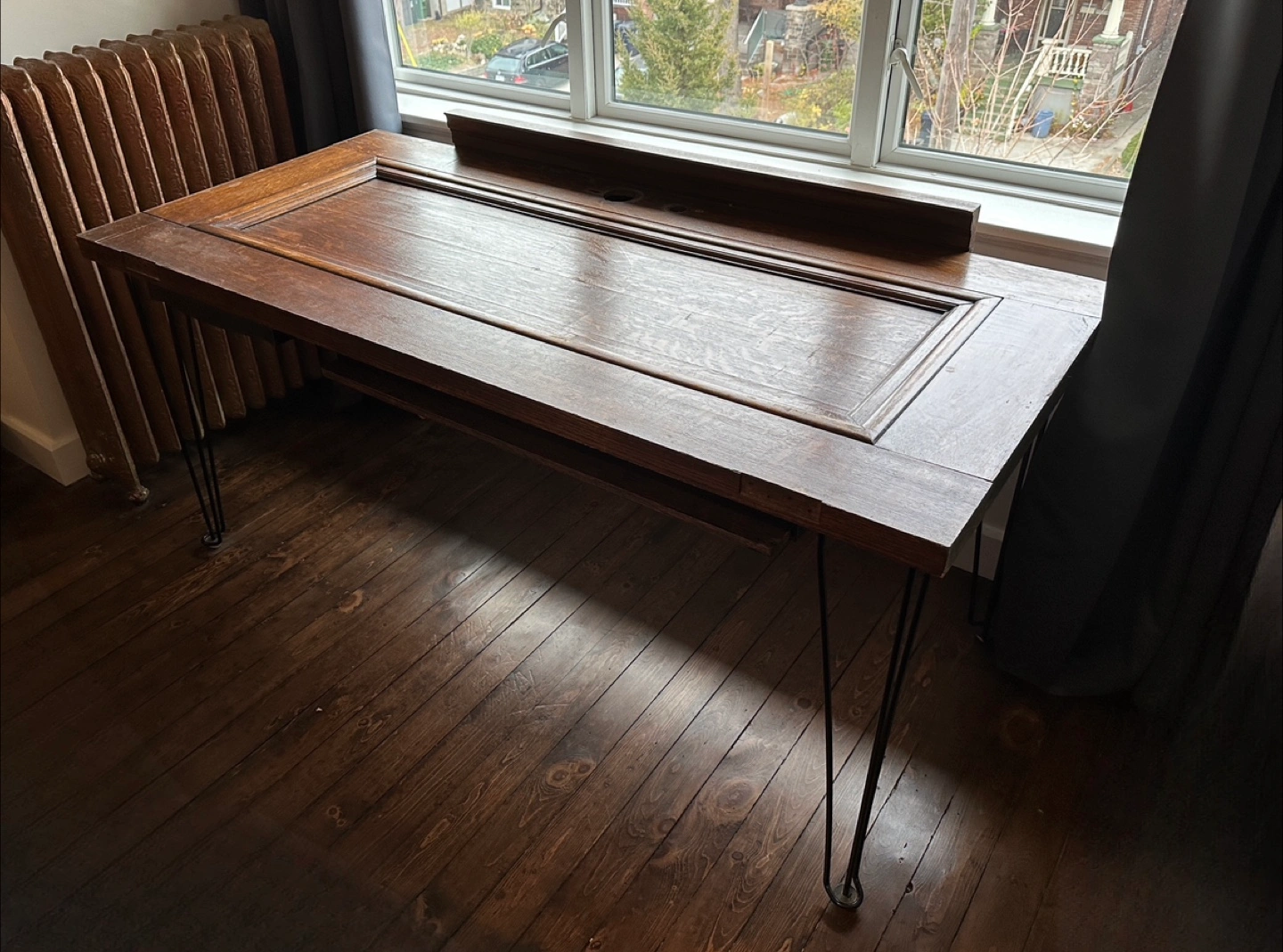 Selling a unique desk with a glass top and a wooden base! The door was from an old home and was a mini basement or closet door. Original finish. It features stylish hairpin legs and a wide pull-out keyboard tray.