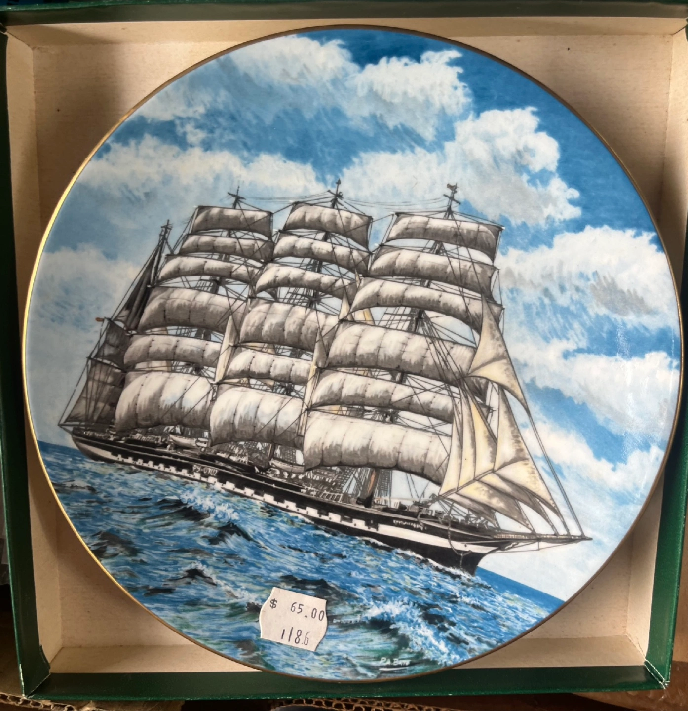 It features a beautiful sailing ship design and comes in its original box. A great piece for collectors or anyone who appreciates nautical art
