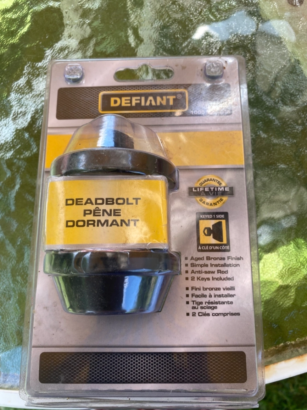 Selling a brand new Defiant deadbolt in aged bronze finish! It's still in its original packaging and includes 2 keys. Simple to install and re-keyable to Defiant or any KW1 compatible key