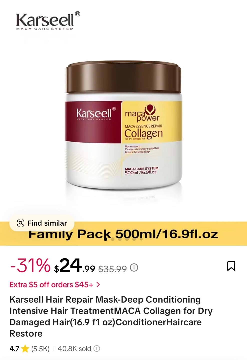 I'm selling a Karseell Maca Essence Repair Collagen hair mask! It's designed for dry and damaged hair. This mask cleanses chemically treated hair and relaxes the tense scalp. It comes in a 500ml/16.9 fl.oz container