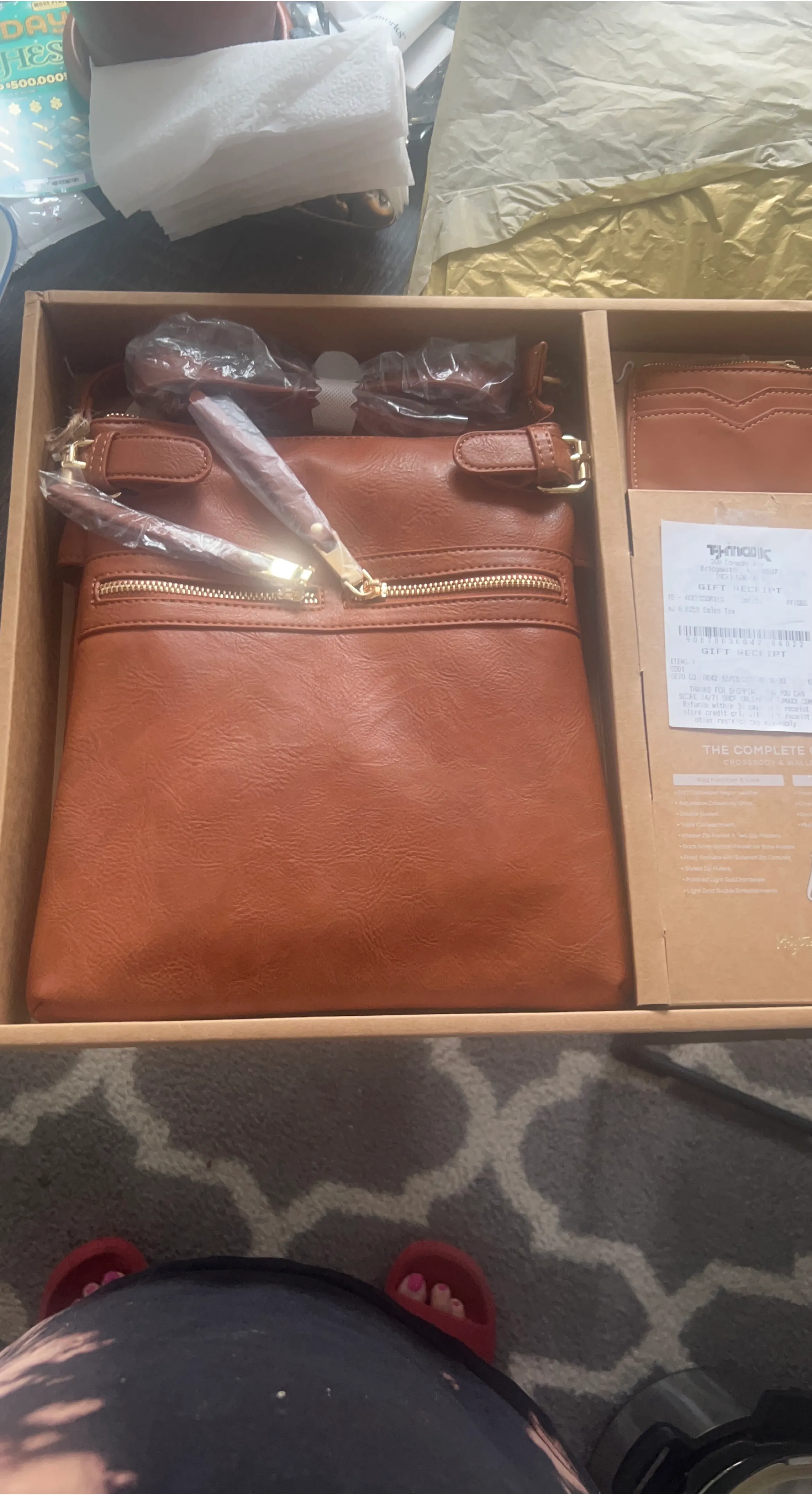 This is a complete crossbody and wallet set in a beautiful brown color! The set includes a crossbody bag and a matching wallet. It has triple compartments and front pockets for convenience. The bag is made from soft, distinguished vegan leather with adjustable crossbody straps and styled zip pullers. It also has polarized light gold hardware and light gold buckle embellishments. Brand new never opened in gift set with gift receipt.