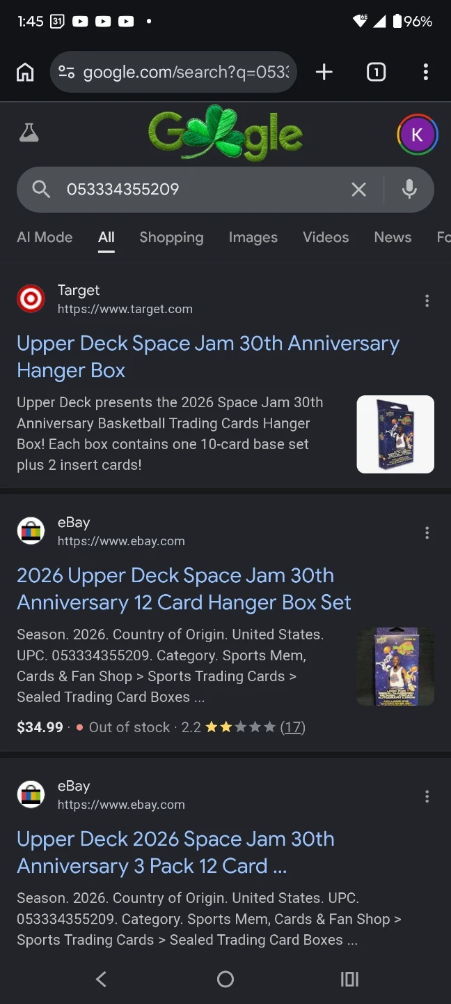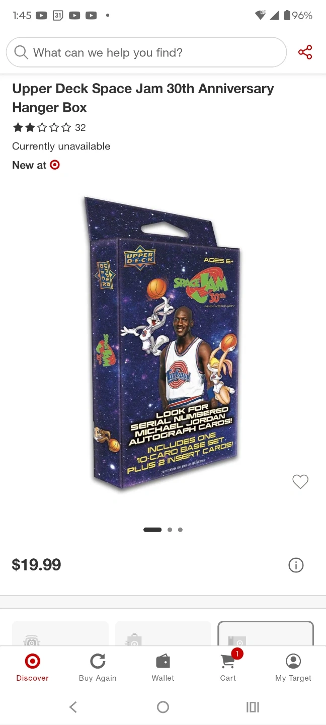 Take all 4 for $50!!! This box contains a set of Space Jam 30th Anniversary trading cards. It includes one 10-card base set plus 2 insert cards. Randomly inserted into these packs are serial numbered Michael Jordan autograph cards!