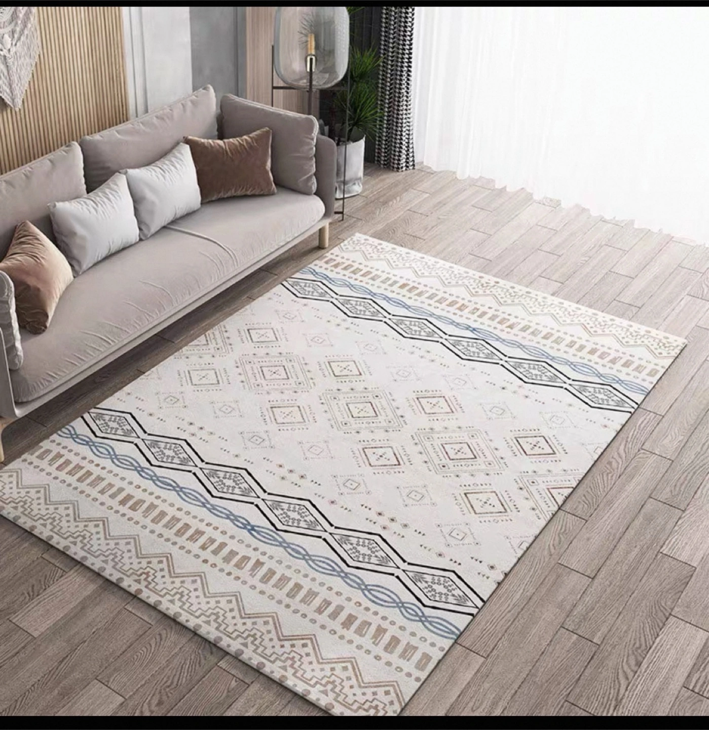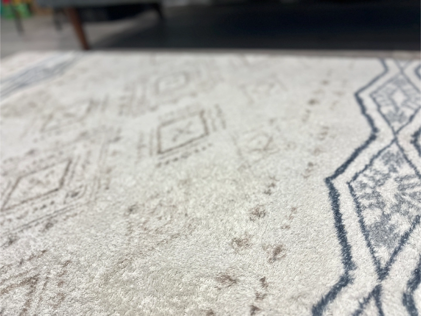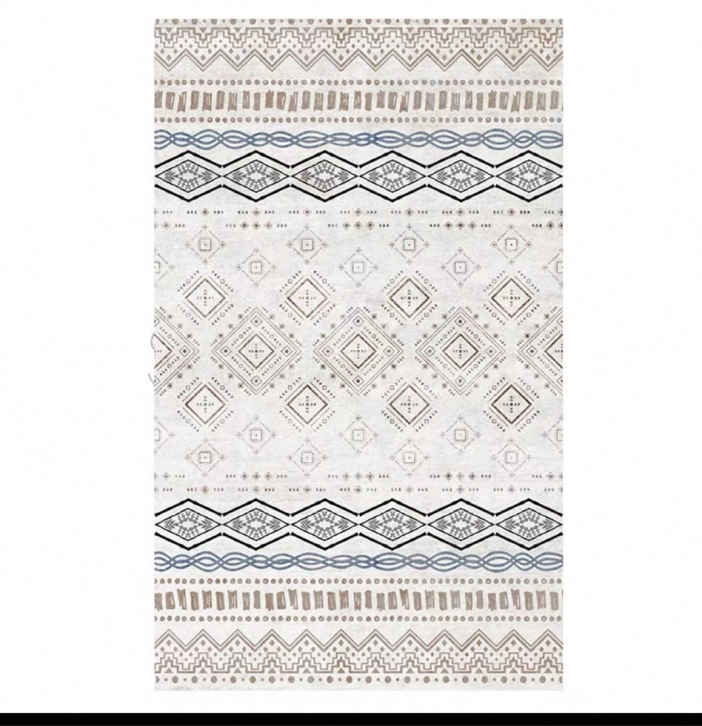 Cream coloured rug. Features a repeating geometric pattern in shades of brown, blue and grey. Soft, plush texture. Perfect for living room or bedroom.