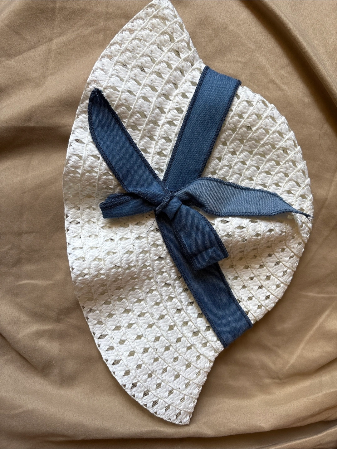 Selling a cute white sun hat with a blue ribbon! It's in great condition and perfect for sunny days out and about. It'll keep you stylish and shaded!