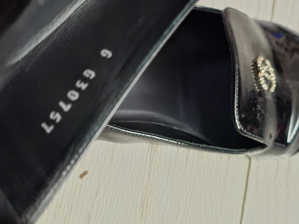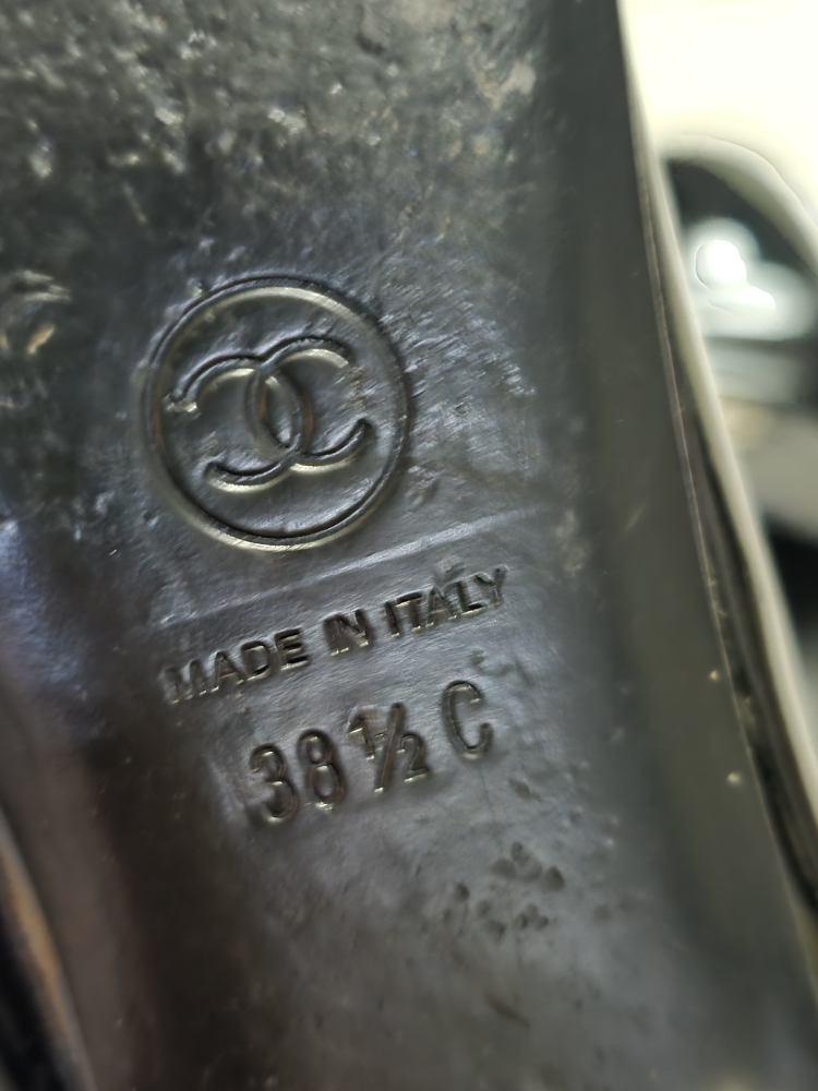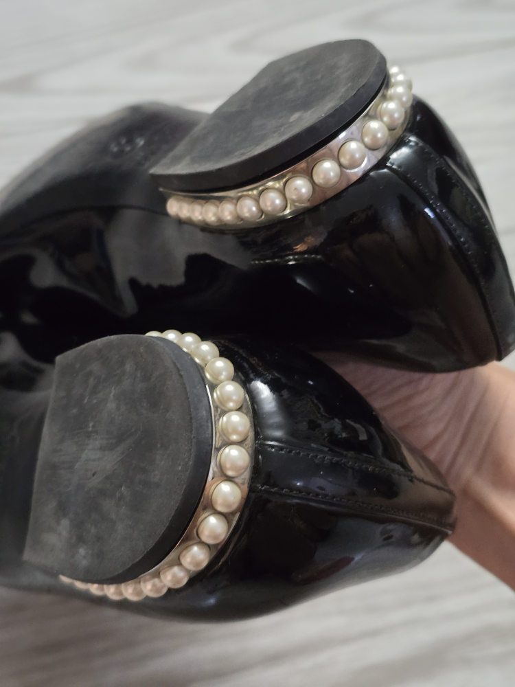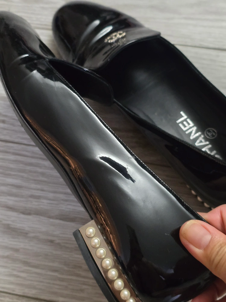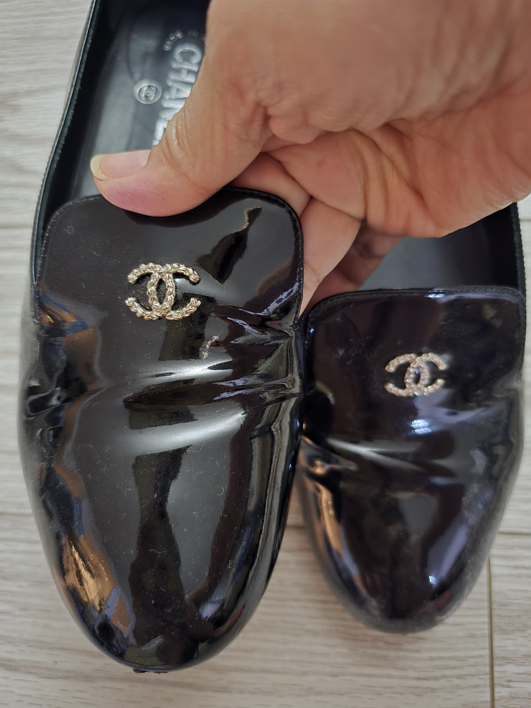 These are a pair of Chanel black patent leather loafers. They feature the iconic Chanel logo on the front and a pearl detail around the heel. Made in Italy.