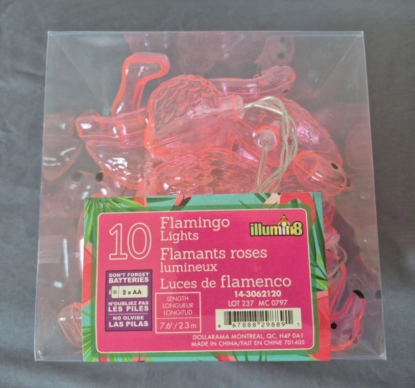 These adorable Flamingo Lights are brand new in the box! They require 2 AA batteries. Great for a tropical touch, indoor or outdoor.
