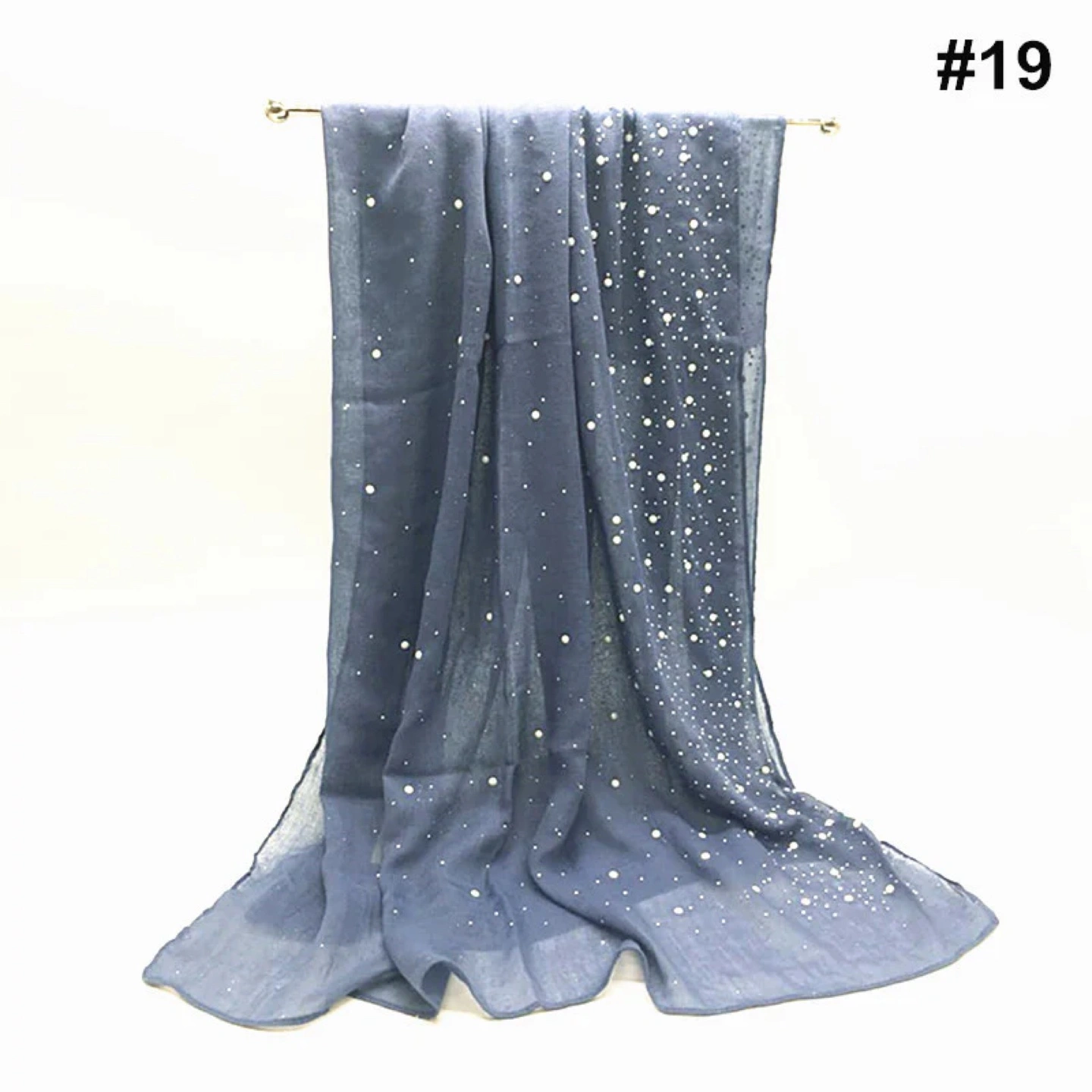 - Thin, dark grey scarf/shawl with white pearls and small, silver rhinestones.