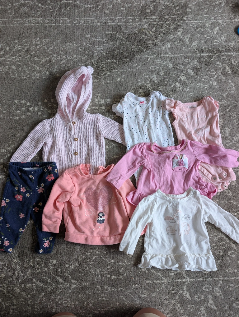 A bundle of baby clothes in sizes 3-6 months from Carter's and Joe Fresh! Includes a variety of tops, bottoms, and a cute hooded sweater. $20 for the whole lot!