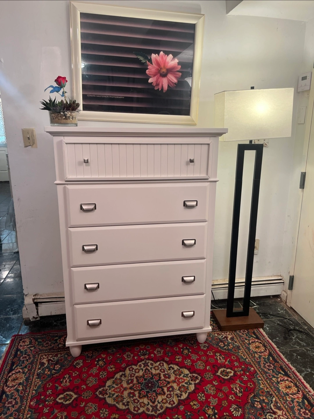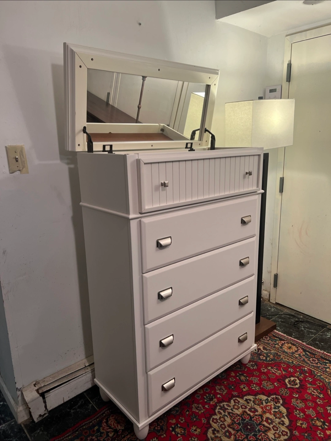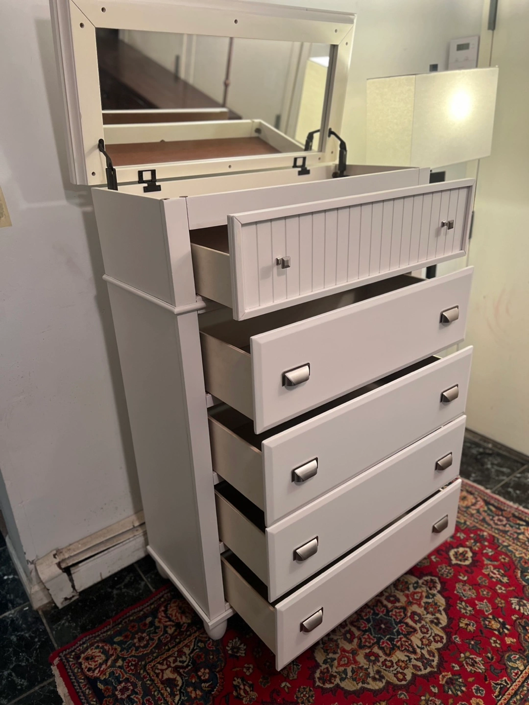 415For sale: a stunning five-drawer dresser, in excellent condition. This piece features a convenient top storage compartment that opens to reveal a stylish mirror. Its eye-catching aesthetic is both unique and chic, making it a perfect addition to any home decor. Crafted with quality in mind, this dresser is sturdy and well-made, ensuring longevity. Each drawer operates smoothly, while the inner compartments are fresh, clean, and inviting, ready to hold your belongings. Very minimal cosmetic wear. Dimensions: 16.5” D x 36” W x 52” H Delivery is available for an additional fee, which varies based on your location. For your convenience, payment can be made via cash, Venmo, Zelle, or CashApp