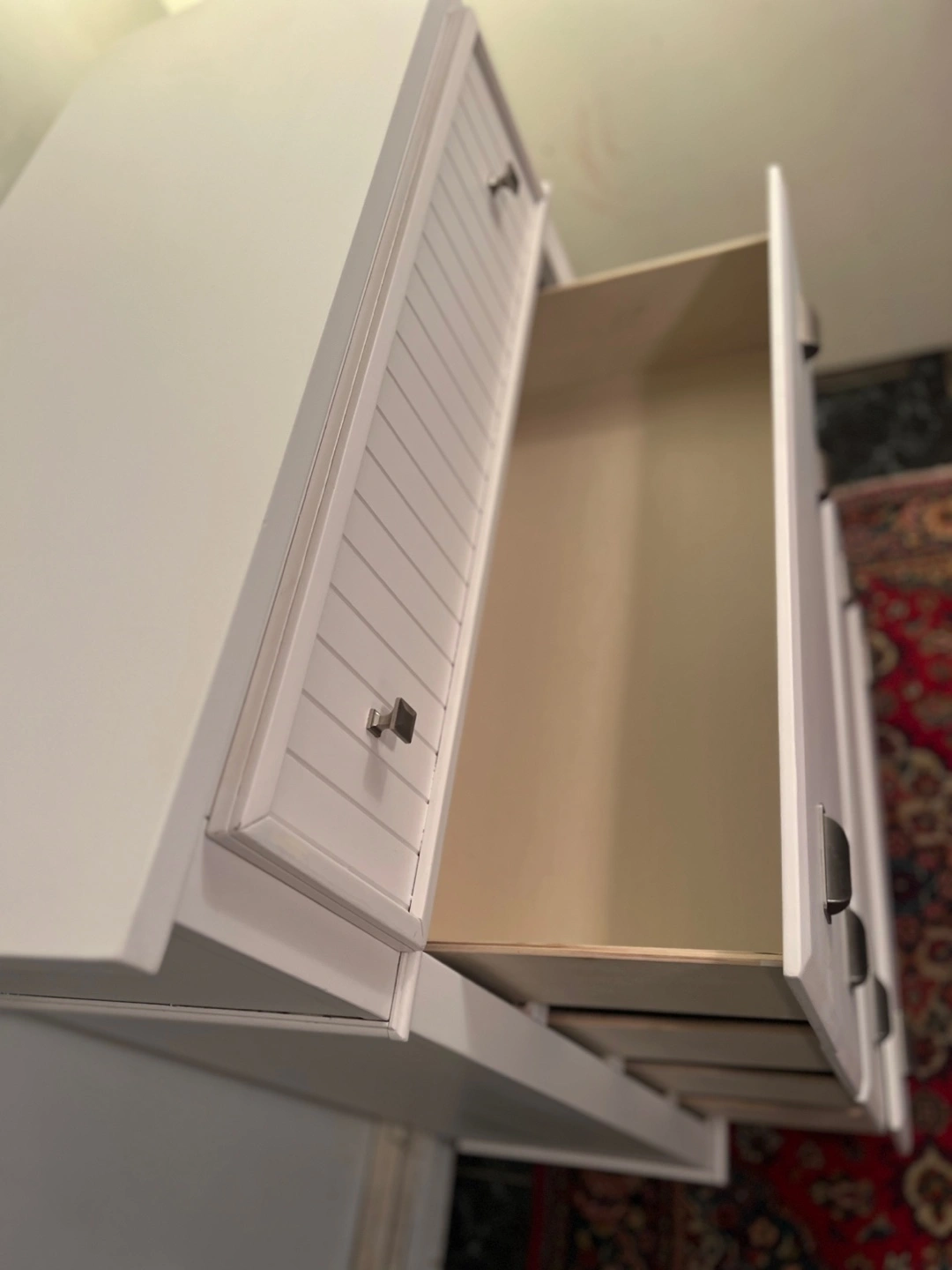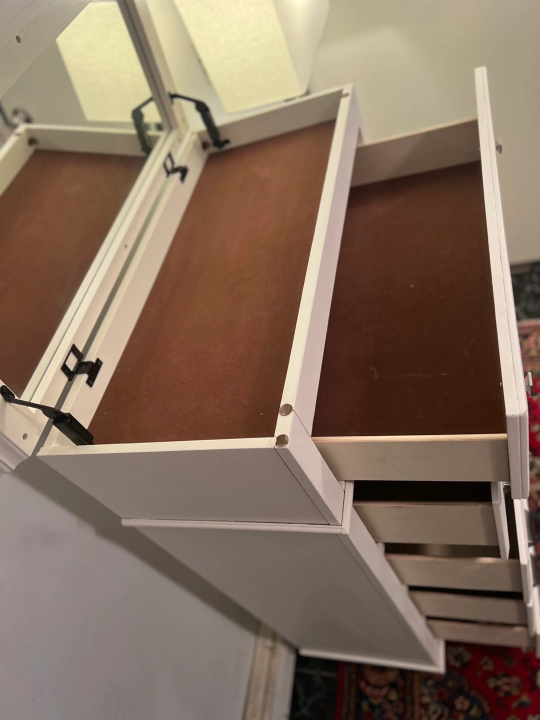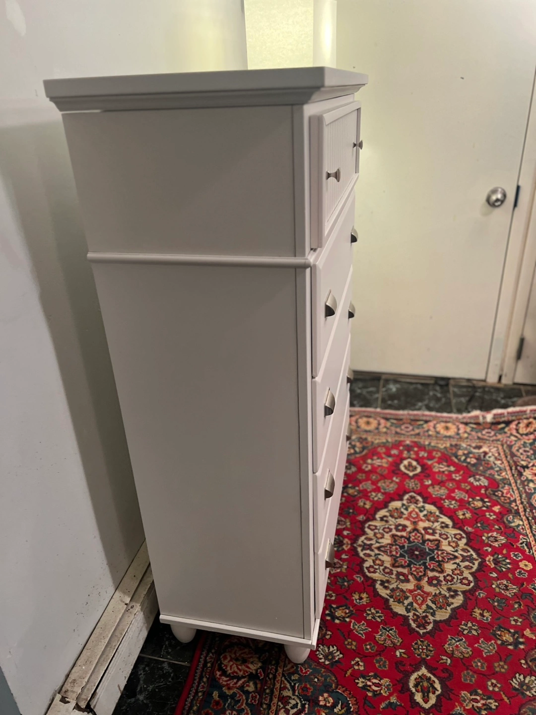 415For sale: a stunning five-drawer dresser, in excellent condition. This piece features a convenient top storage compartment that opens to reveal a stylish mirror. Its eye-catching aesthetic is both unique and chic, making it a perfect addition to any home decor. Crafted with quality in mind, this dresser is sturdy and well-made, ensuring longevity. Each drawer operates smoothly, while the inner compartments are fresh, clean, and inviting, ready to hold your belongings. Very minimal cosmetic wear. Dimensions: 16.5” D x 36” W x 52” H Delivery is available for an additional fee, which varies based on your location. For your convenience, payment can be made via cash, Venmo, Zelle, or CashApp